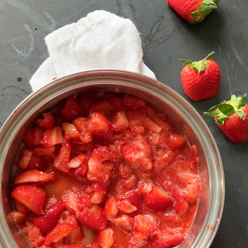 Rinse strawberries and remove green tops. Place berries in a medium saucepan and mash them coarsely (either using a potato masher or your hands). Cook the strawberries over medium heat, stirring frequently, until they begin to thicken (about 10 minutes).