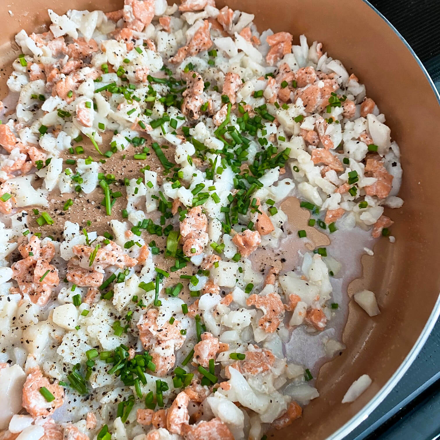 Finely dice 4 oz. of the salmon. In a large saute pan or skillet,melt the unsalted butter over medium heat and saute the cod, diced salmon, and scallops for 5 minutes or until opaque. Remove from heat and season with salt, pepper, and chives. Set aside.