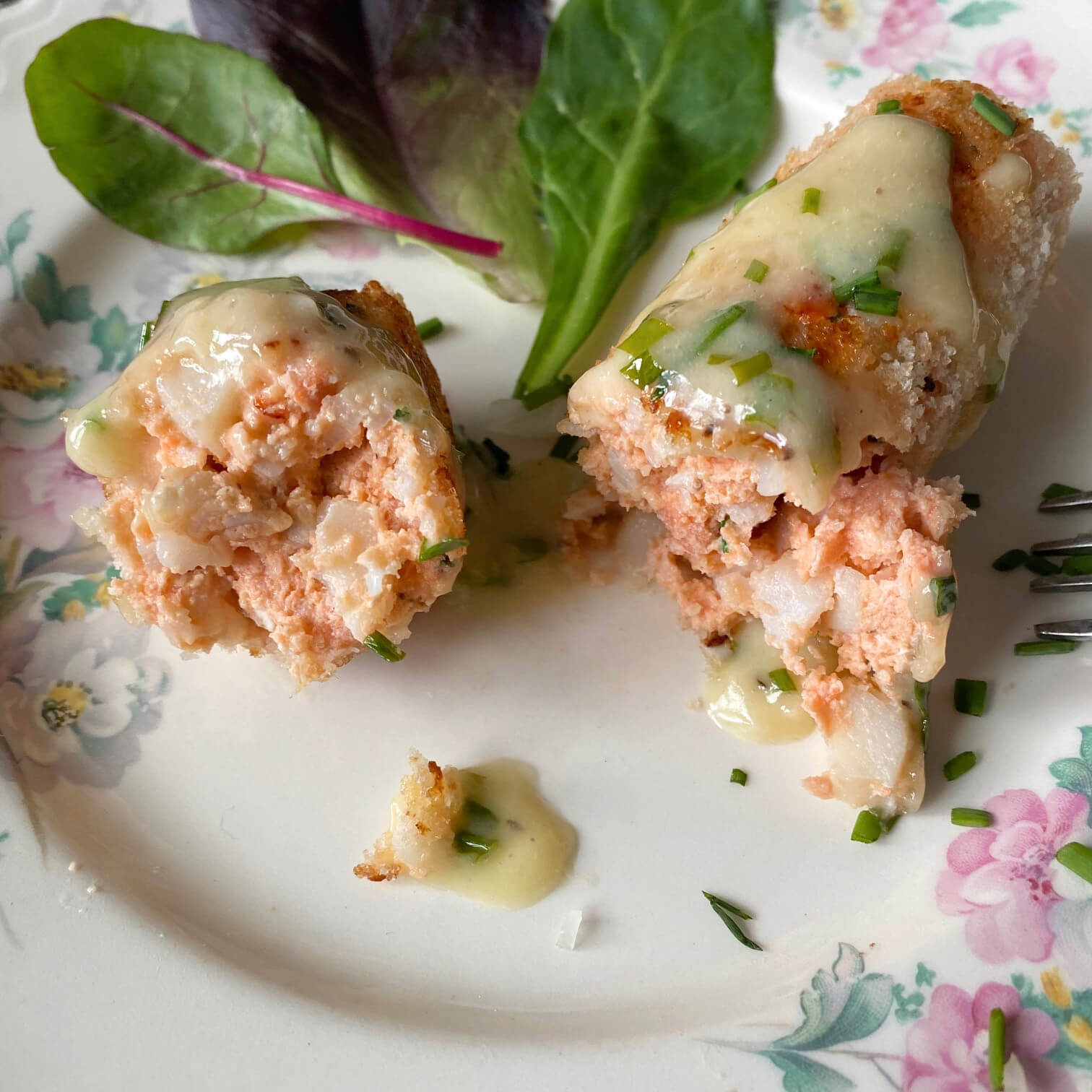 The recipe, Seafood Sausages with Chive Sauce is similar to crab cakes but in a sausage shape. Protein-laden, it is an extravagant dish that you might reserve for special occasions or jubilant merrymaking holidays like today when you want to surprise your dinner mates with something out of the ordinary. Rich, filling, and full of flavor, the sausages are fun to make, and they involve a unique technique. Like a fleet of canoes bobbing on the Irish Sea, the sausages are simmered in plastic wrap where they steam and plump their way into shape before being rolled in bread crumbs and sauteed in butter. Once plated, they are drizzled with more butter in the form of a silky chive sauce. The result is a totally decadent dining experience that sits on the same level of other indulgent foods like lobster with drawn butter, Eggs Benedict, and Beef Wellington. Colorful and unique, this is a recipe that offers much in the way of interest and would be lovely for other spring-time holidays like Mother’s Day or Easter in addition to St. Pat’s.