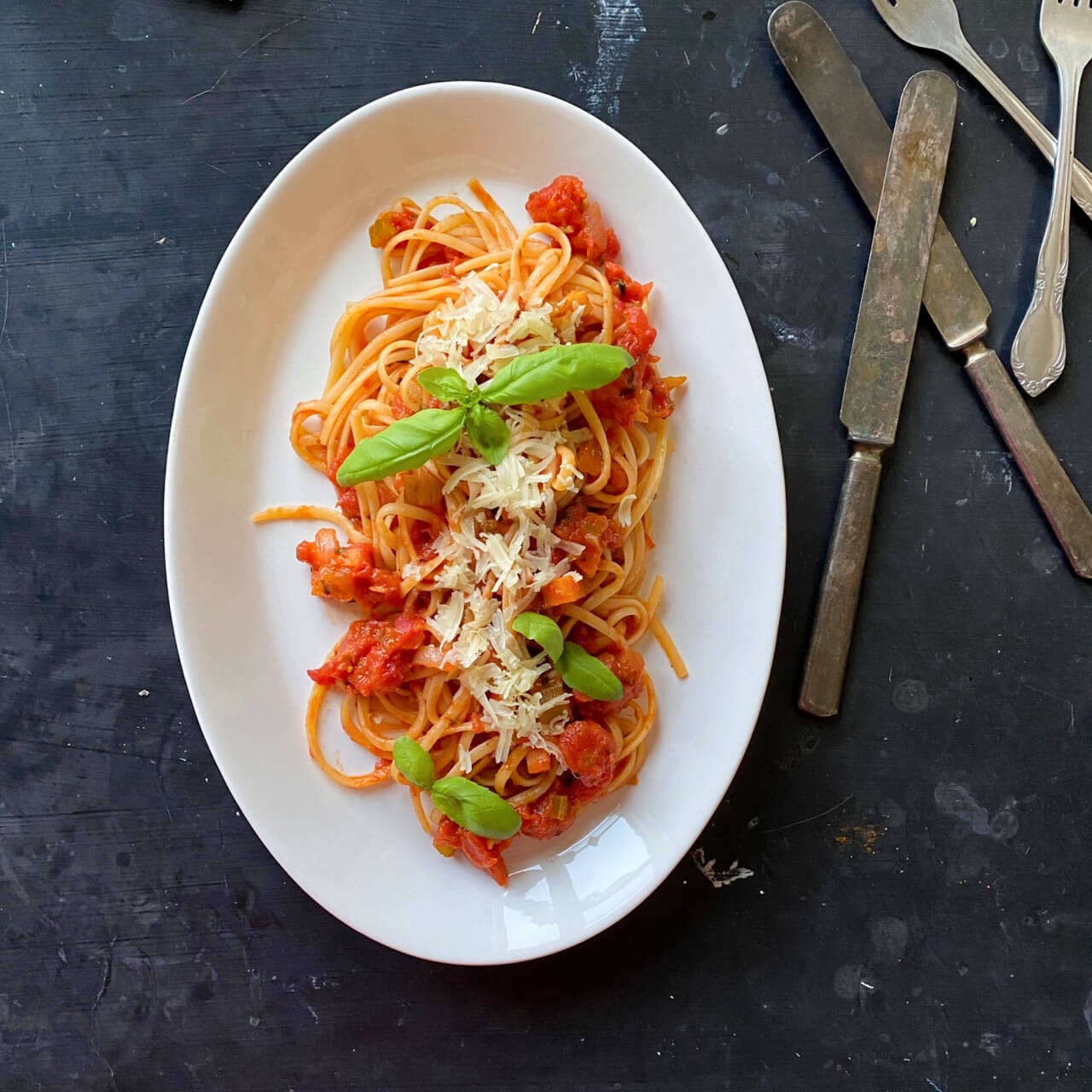 One of Audrey’s most favorite foods, which she ate on a weekly basis, was a simple garden-centric dish that can be thrown together in minutes with barely any technical instruction. In today’s post, we are making Audrey’s favorite pasta recipe, Spaghetti al Pomadoro…