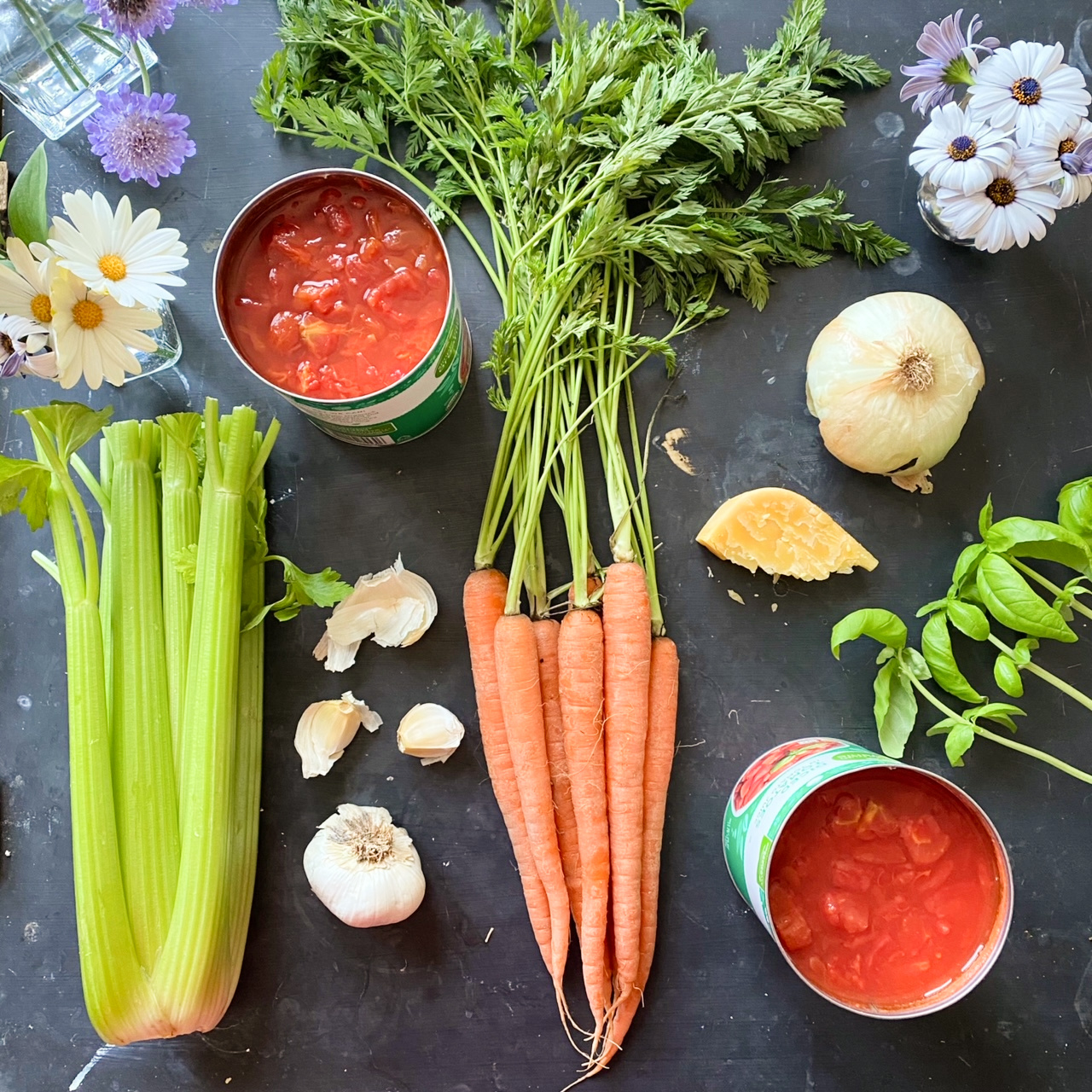 Peel and dice onion, carrots, garlic and celery. Put in a large pot. Add two large tins of Italian roma tomatoes and the basil. Add a long drizzle of olive oil and simmer on low for 45 minutes. Turn off heat and let sauce rest for 15 minutes. Serve over 1 box of pasta cooked al dente, with fresh parmesean and the other half of the basil cut in pieces with scissors.