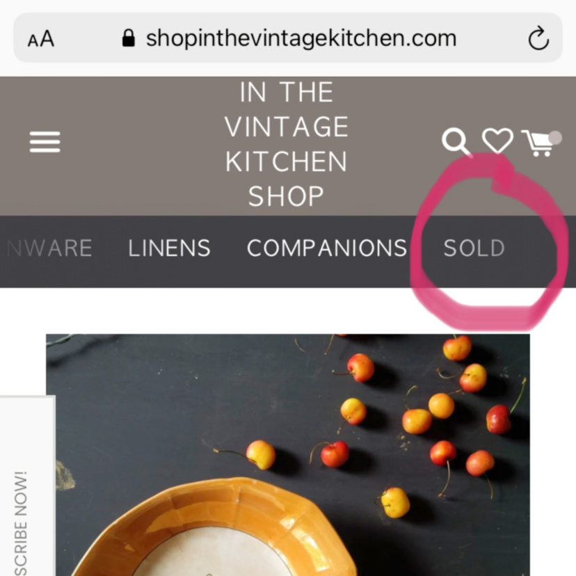 If you would like to be made aware of new items listed in the shop each week, along with special promotions and added seasonal content, then please sign up for our new email newsletter which will be going out once a week (starting next Friday). Unlike many of these blog posts, this newsletter is designed to be a quick read, featuring mainly photographs and a few links to some fun content. In response to many shoppers asking how they can be kept aware of new items coming to the Vintage Kitchen, and after testing out many avenues over the past few weeks, I’m excited to finally have a good solution that will help collectors find what they love quickly. Sign up for the email newsletter by clicking the subscribe now button on the left-hand side of the shop’s home page here. It looks like this…
