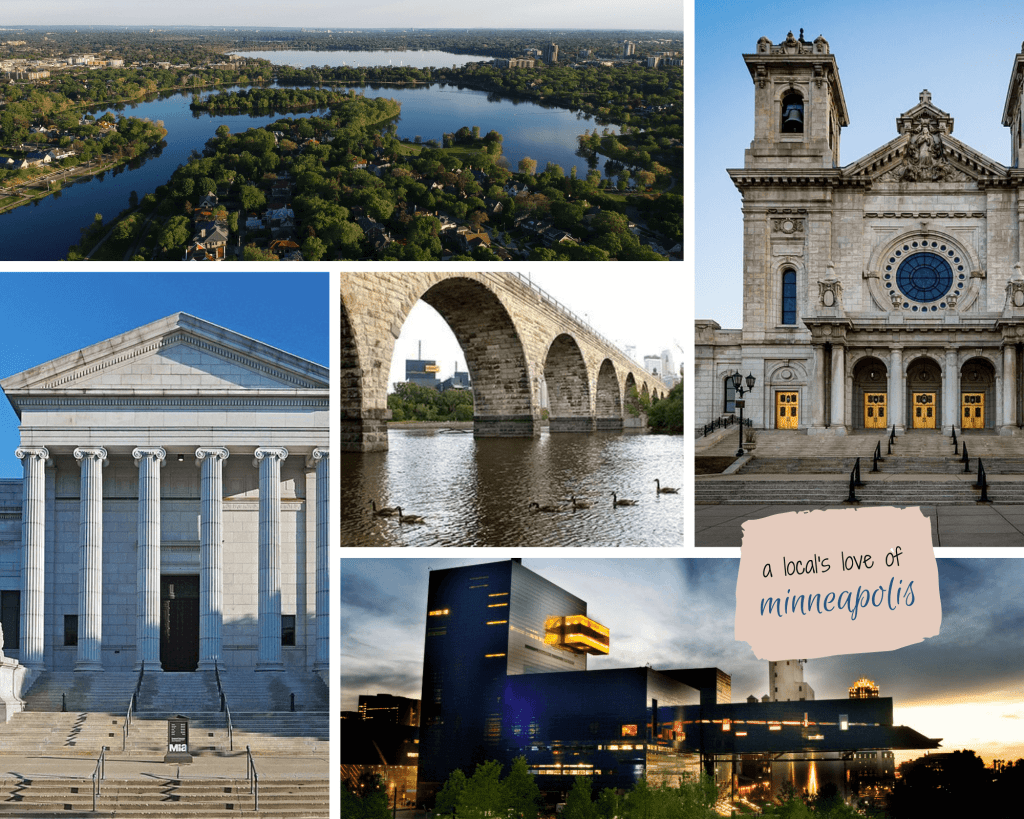 The sights that inspire DeDe in and around Minneapolis. Clockwise from top left: The Minneapolis Chain of Lakes; The Basilica of St. Mary (switchroyale); The Gutherie Theater (Mark Vandeve); The Minneapolis Institute of Art (McGhiever); The Stone Bridge Arch (Minneapolis Parks and Recreation Board).