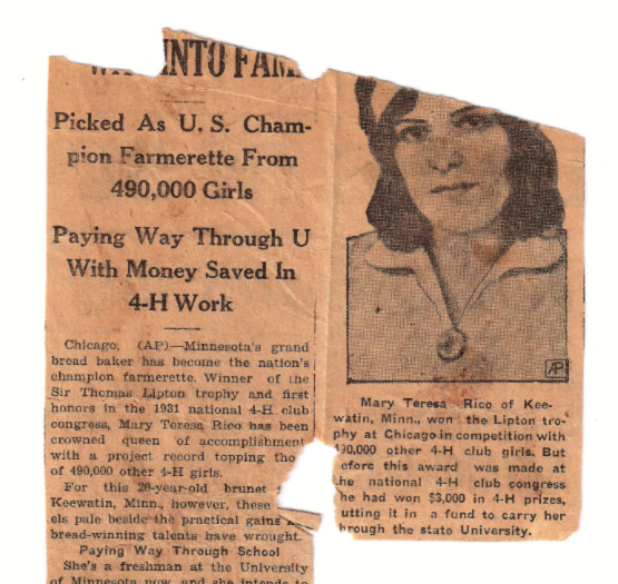 EDITORIAL NOTE: During her childhood throughout the 1920s, starting at the age of 10, Teresa was involved in 4-H, a youth development program whose mission was (and still is!) “to encourage kids to reach their fullest potential while also creating positive change within their community.” This experience turned out to be a gateway for Teresa – one in which she could showcase her natural talents and abilities. While naturally gifted in a range of extra-curricular activities including basketball, tennis and dramatics, two of Teresa’s most prized talents were baking and sewing. A consistent winner at state and county fairs, between the years 1921 and 1931, Teresa baked more than 1,000 cakes and 2,000 loaves of bread which she sold to local residents in an effort to raise money for her college tuition. Triumphantly, through those entrepreneurial endeavors, Teresa managed to raise $3000.00, which provided enough for her to enroll in the University of Minnesota.