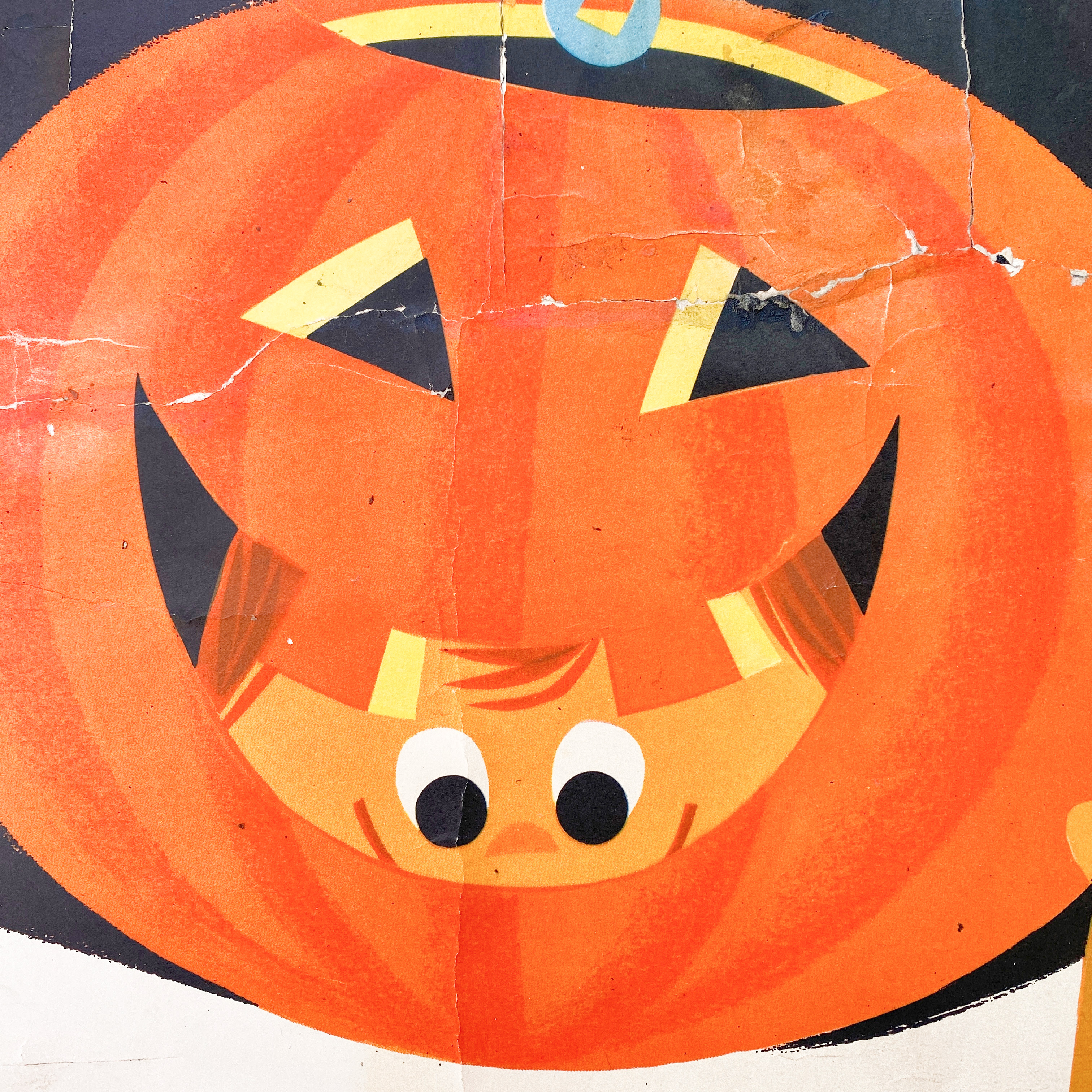 Measuring 25″ inches x 14.25″ inches it is a true survivor of history and a real-life example of the Advisory Board’s cute and colorful messaging. Most food store advertising was discarded in the trash promptly after a promotion ended to make way for new advertising in its place. Printed on thin, inexpensive paper these eye-catching advertisements were not made to last more than 60 days let alone six decades. Oftentimes, they were hung in store windows exposed to heat, sun,, humidity, and temperature changes which would cause them to crinkle and fade over time. When I found this one, it was in fragile and brittle shape and was held together only by hope and a dehydrated rubber band. Ripped and torn in so many places it was impossible to unravel it without it completely breaking apart. A quick peek down the interior of its rolled-up shape, yielded the image of a pumpkin face smiling back. How fun! Home to the Kitchen it came for further investigation and repair.