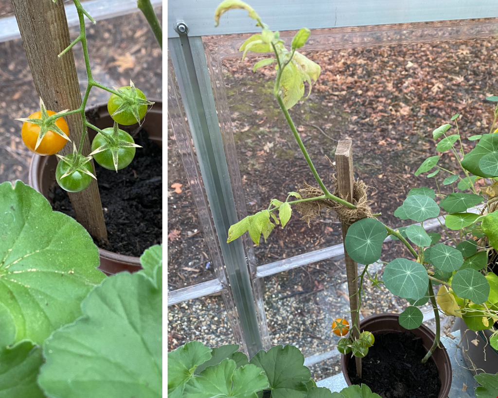 On the good news front, most of the plants bounced right back including the withery, weepy, unhappy tomato branch clipping who is now getting ready to offer up more cherry sized tomatoes…