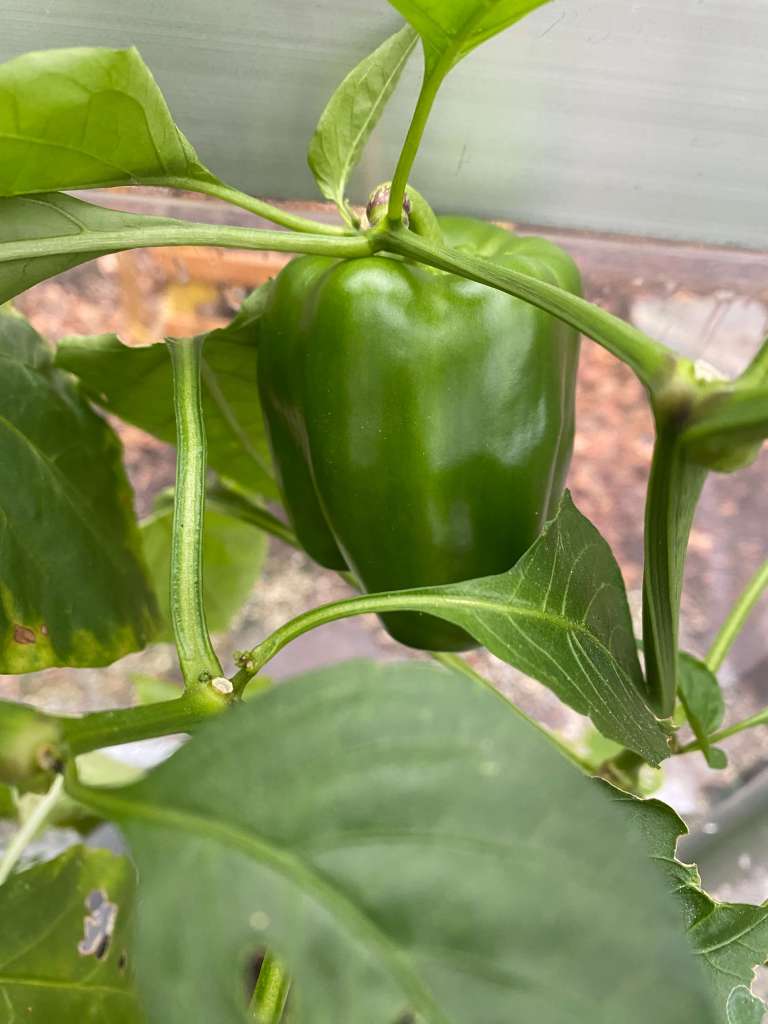 Out of time, but not yet fully grown, just before the fall frost I transplanted three of the strongest plants to see if they would continue growing in the greenhouse. Two of the three were hot pepper plants of the jalapeno and chile variety and then the third plant was a bell pepper. I thought I had transplanted an heirloom variety called California Wonder, which if not picked when green will ripen to a deep red shade. But based on its shape right now, it could be the other pepper plant we experimented with – Orange Sun – which will as its name suggests, turn a vibrant orange when ready for harvest. In both cases, the longer the pepper sits on the vine the sweeter it gets. So a surprise is in store as we wait to see what color it turns out to be…
