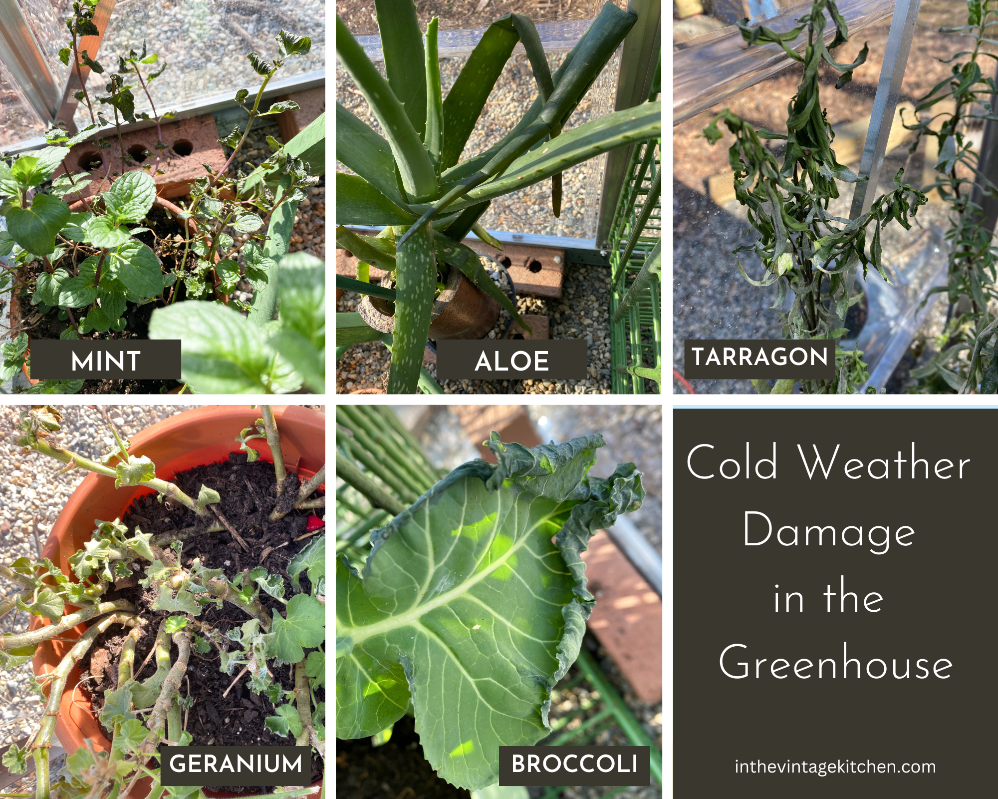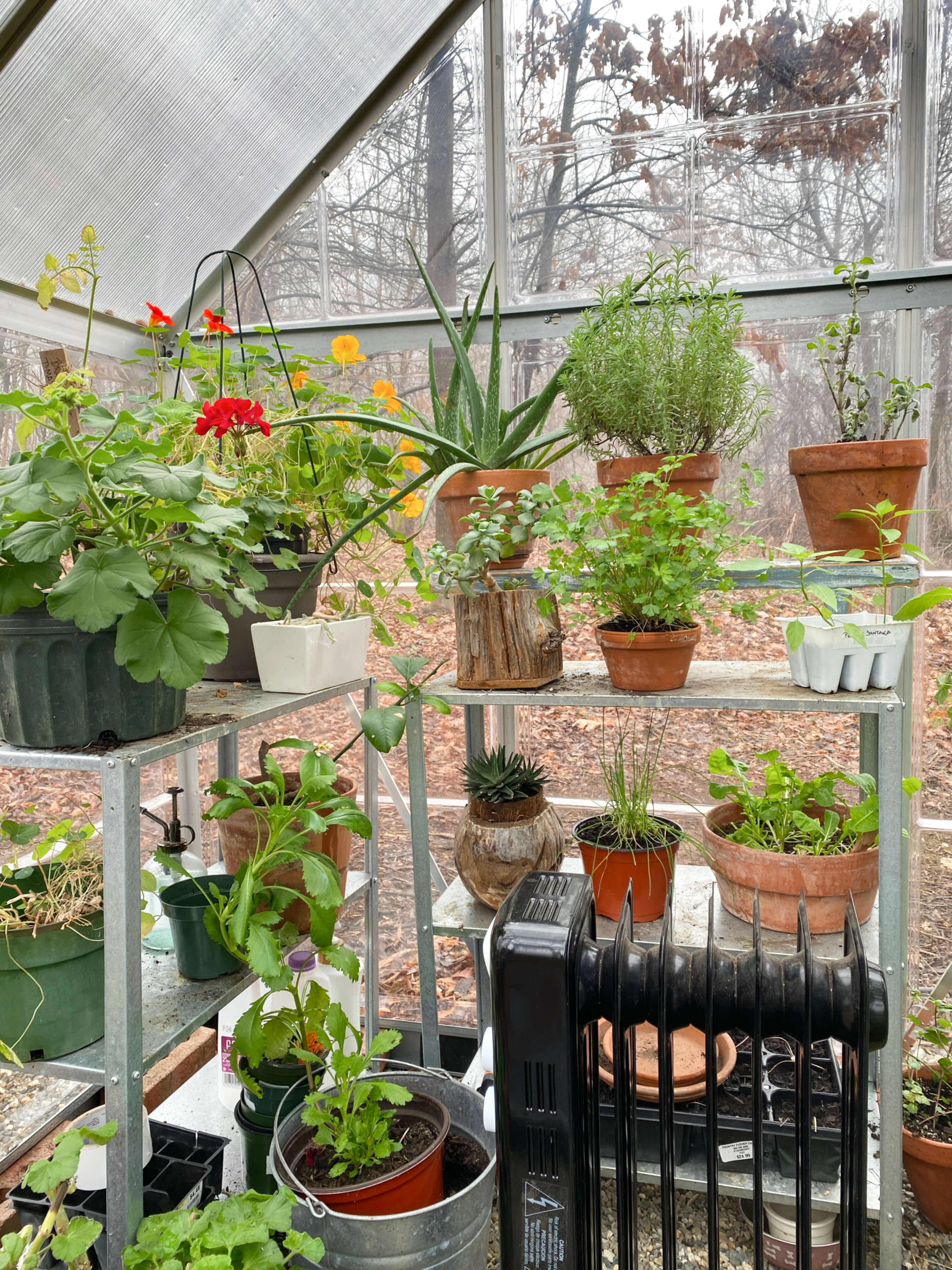 Well as it turns out, first-hand experience is an excellent advisor. I can see now how the haybales would have been helpful through the cold snap. Like everybody across the country during Christmas week, we experienced the freezing polar vortex temperatures with daily highs between 9-19 degrees and nightly lows between 6-12 degrees. The indoor temperatures in the greenhouse on these coldest nights, with the heater going full blast, hovered in the high 30s and low 40s, which was pretty good considering the chilly weather. The coldest area of the greenhouse was the pea gravel floor which is where the broccoli, marigolds, aloe, mint, thyme, tarragon, basil, rosemary and geranium pots sit.