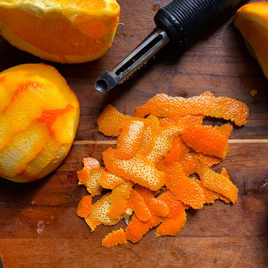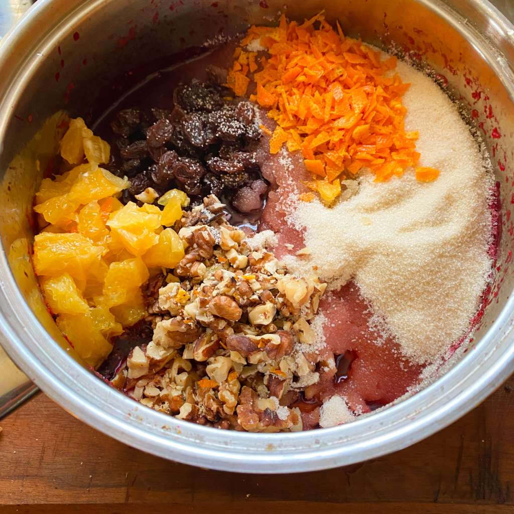 and then add the boiling water, raisins, walnuts, and sugar. Peel the oranges and dice the pulp. Scrap any white pith off the orange rinds, discard the pith, and dice the orange rinds. Add the rind to the mixture.