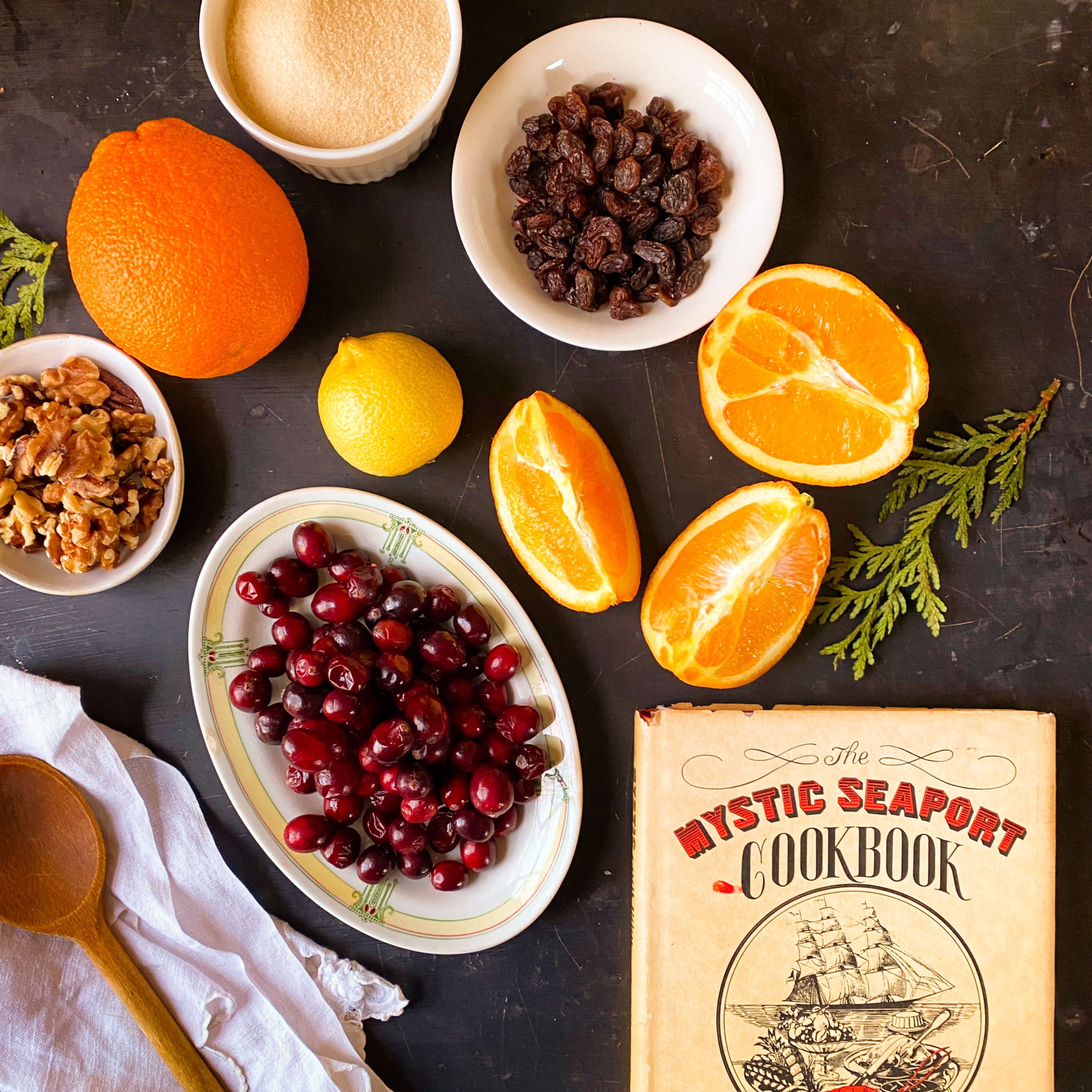 Pick up any New England cookbook, and the author will have their own preferred method of making this holiday side dish, but there will always be some ingredients that everyone agrees on. Technically, what differentiates cranberry sauce from cranberry relish is the cooking process. Cranberry sauce generally tends to be cooked on the stovetop – boiled down with sugar to a sweetened consistency that is thin and syrupy or thick and gelatinous depending on the amount of cooking time. Relish, on the other hand, more often than not, is mixed together in a blender and served chunky and raw with the addition of just a bit of sugar and some other aromatics including spices and citrus. The recipe featured here today is a cross between both. It’s cooked on the stove and includes citrus, raisins, and nuts for a more chutney-like consistency. The chunky texture and quick cooking method, make this Mystic recipe easy and versatile – ideal for all sorts of applications long after the Thanksgiving meal has been enjoyed.