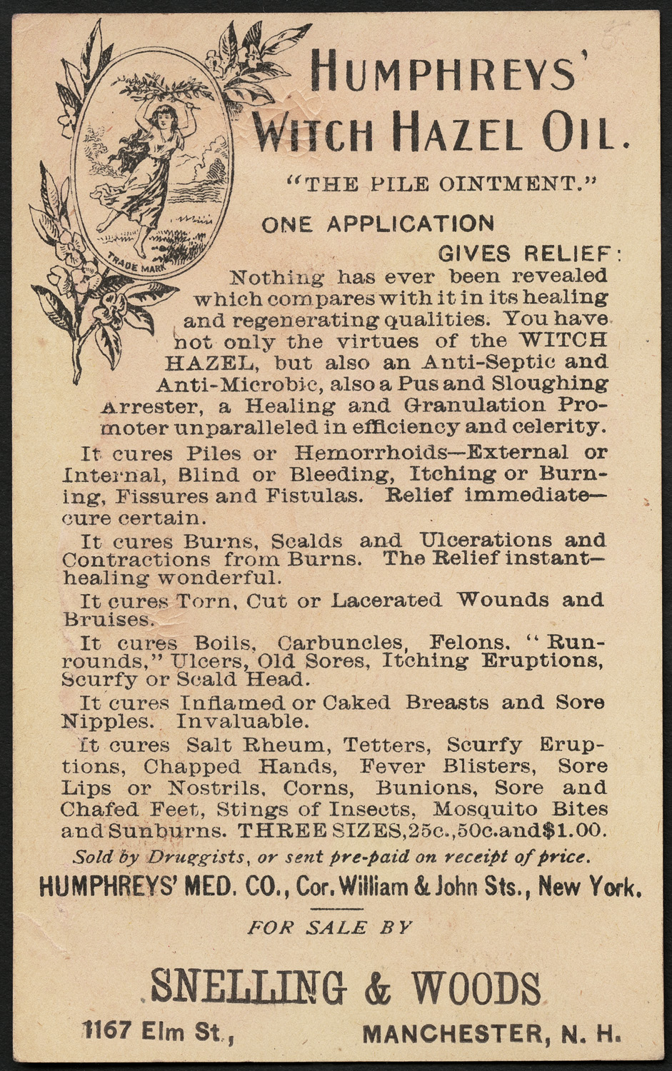 Humphrey’s Witch Hazel Oil was made in New Hampshire in the 1870s. Image courtesy of the Boston Public Library.