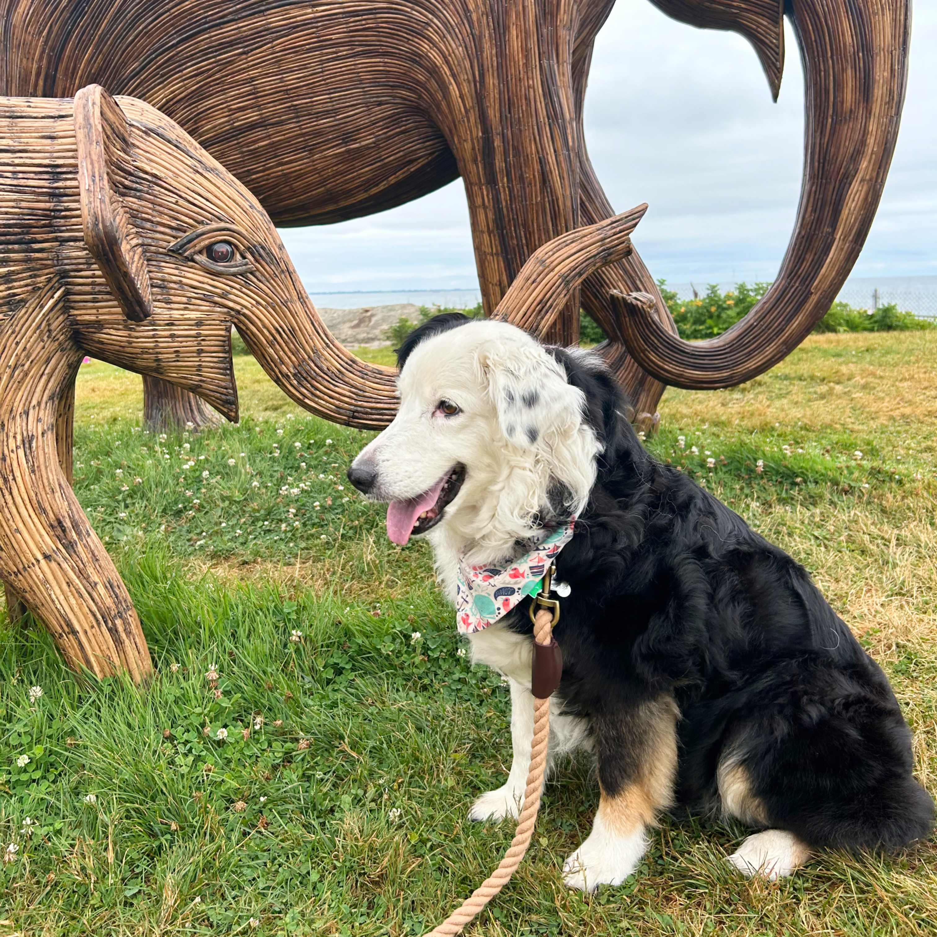 The end of July brought a road trip to a specialty vet hospital in Rhode Island where she had an echocardiogram to give us more insight into her condition and to make sure she was on the right track with her medications. We made a fun adventure out of it, stopping for lunch and to see the elephant migration sculptures in Newport. There, she settled down next to a baby elephant like it was her new best friend.