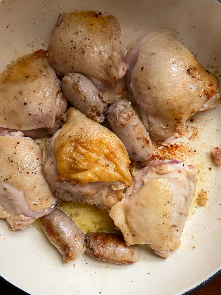 Heat olive oil over medium-high heat in a large ovenproof pan or Dutch oven. Cut sausage links in halves or thirds, depending on length, remove casings if desired. Add sausage and chicken to pot in one layer. Sprinkle with half of the salt and pepper. Let cook about 5 minutes. Turn meat over, season with remaining salt and pepper and cook 5 more minutes. Remove chicken to a plate.