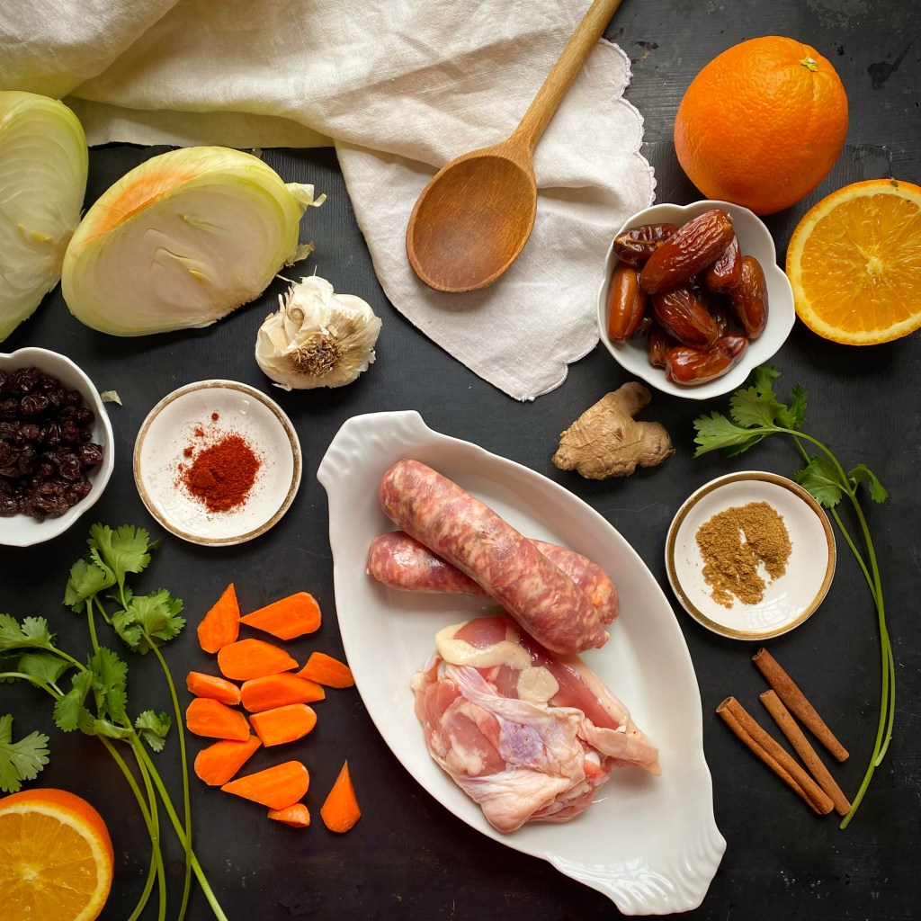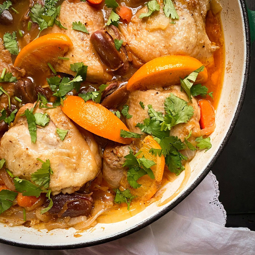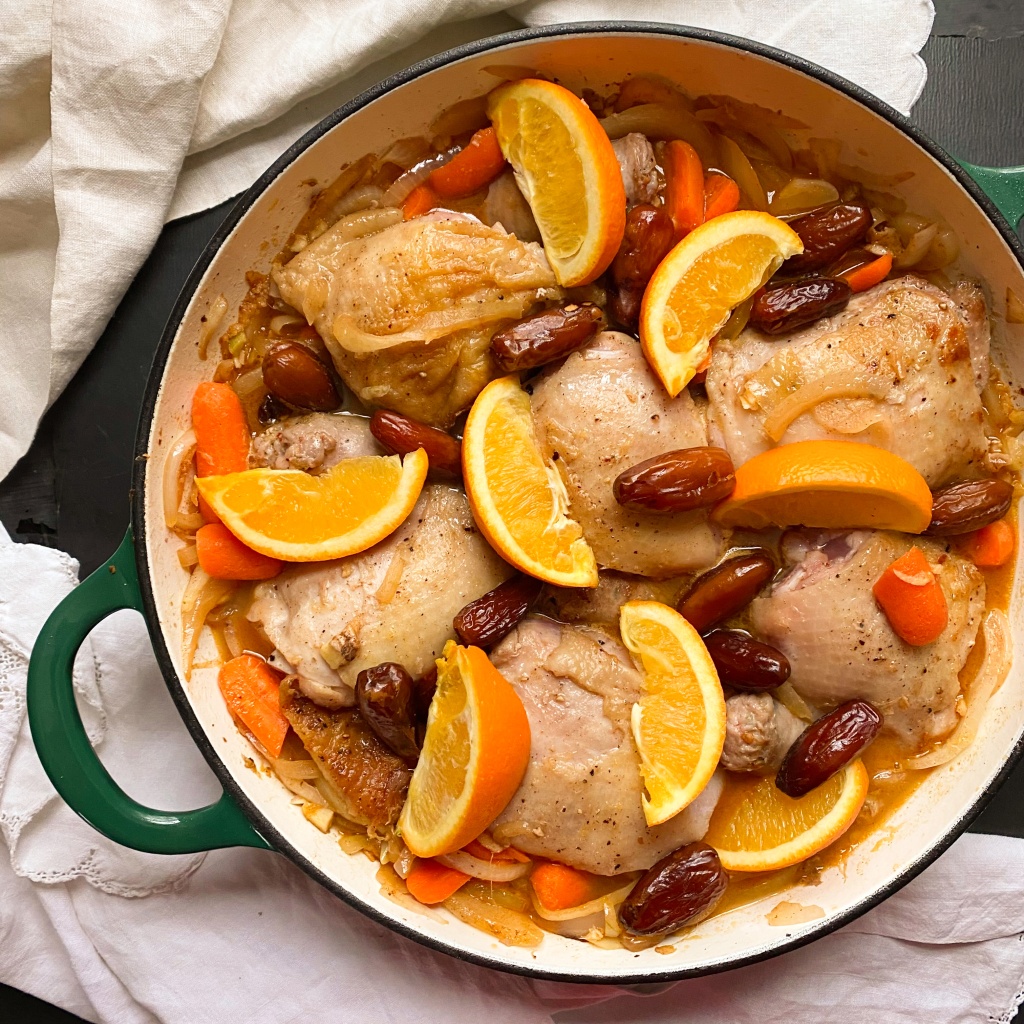 An easy, spice-infused one-pot meal that slow simmers for an hour and a half, Chicken Thighs with Cinnamon and Dates is a cozy and colorful recipe perfectly paired for the wind-chilled winter months. With its aromatic combination of oranges, onions, cinnamon, cumin, ginger, cilantro, paprika and garlic plus two proteins, it is a flavorful ensemble fit for a feast. Once the onions start swimming in the olive oil and the spices are incorporated one by one, the kitchen warms with the scent of holiday cooking. Similar to a wonderful recipe my mom used to make when I was growing up, one that she simply called Israeli Chicken, Kim’s recipe is a savory blend of Middle Eastern and North African flavors punctuated with a bit of Indian spice. For added convienence and a bit of trans-continental flair, in addition to cooking it in the oven, this recipe can also be made in a tagine or in a large pot on the stovetop slow simmered over medium heat.
