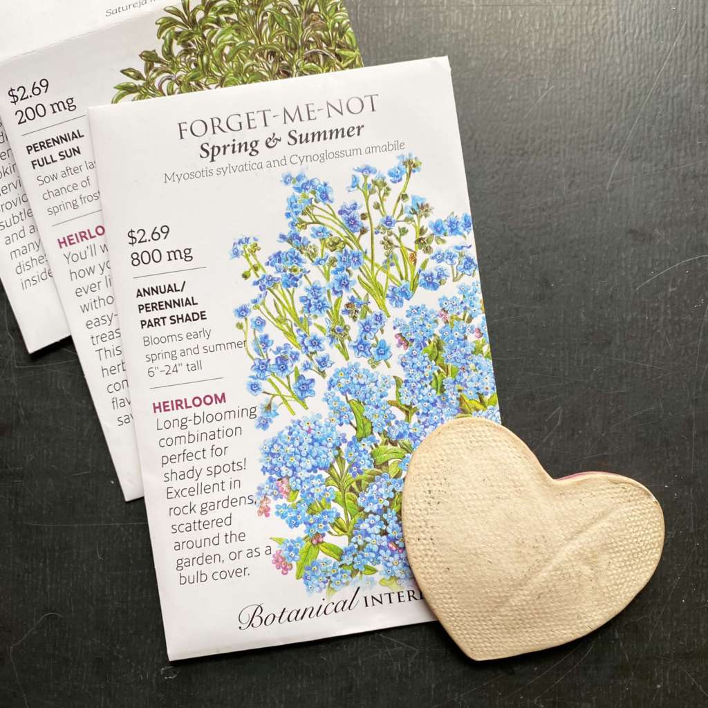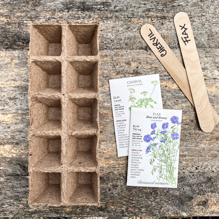 This year our herb garden will include forget-me-nots, feverfew, wild bergamot, lemon balm, flax, dill, basil, nasturtiums, chervil, cilantro, parsley, oregano, echinacea, winter savory, English thyme, German chamomile, sweet peas, chives, sage, rosemary, yarrow, lavender, phlox and two different varieties of calendula. Everything highlighted in bold will go in the shade garden, the rest will be tucked into the full sun spots in the garden bed up front. Half of this list is a new, first-time growing experience for me, which makes this gardening project an exciting one on all fronts.
