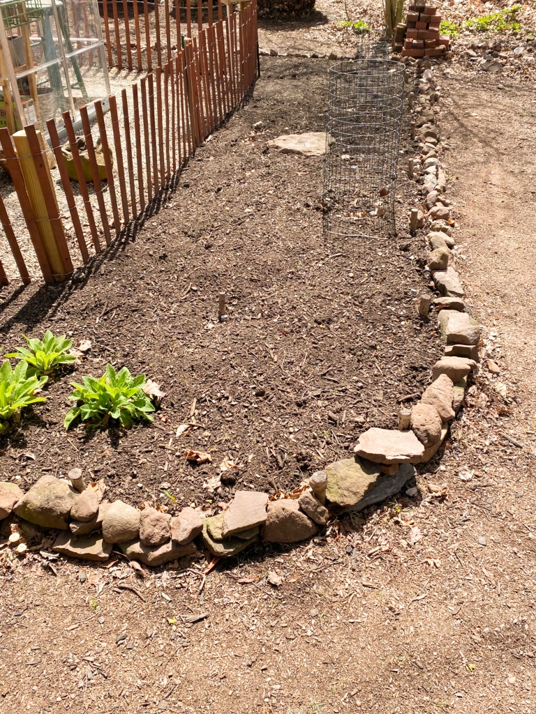 Ideally, I’m striving for a cottage-style herb garden that is full, colorful, and graduated in size. The greenhouse will act as the central focal point, the pea gravel between the fence and the greenhouse will act as a pathway and giant field stones will become stepping stones in the garden beds. To make it visually interesting beyond texture and flower shape, I’ve selected varieties in the pink, purple, blue, white and yellow families to create a unifying color palette that ties in shades from the front gardens as well as a bit of symbolism.