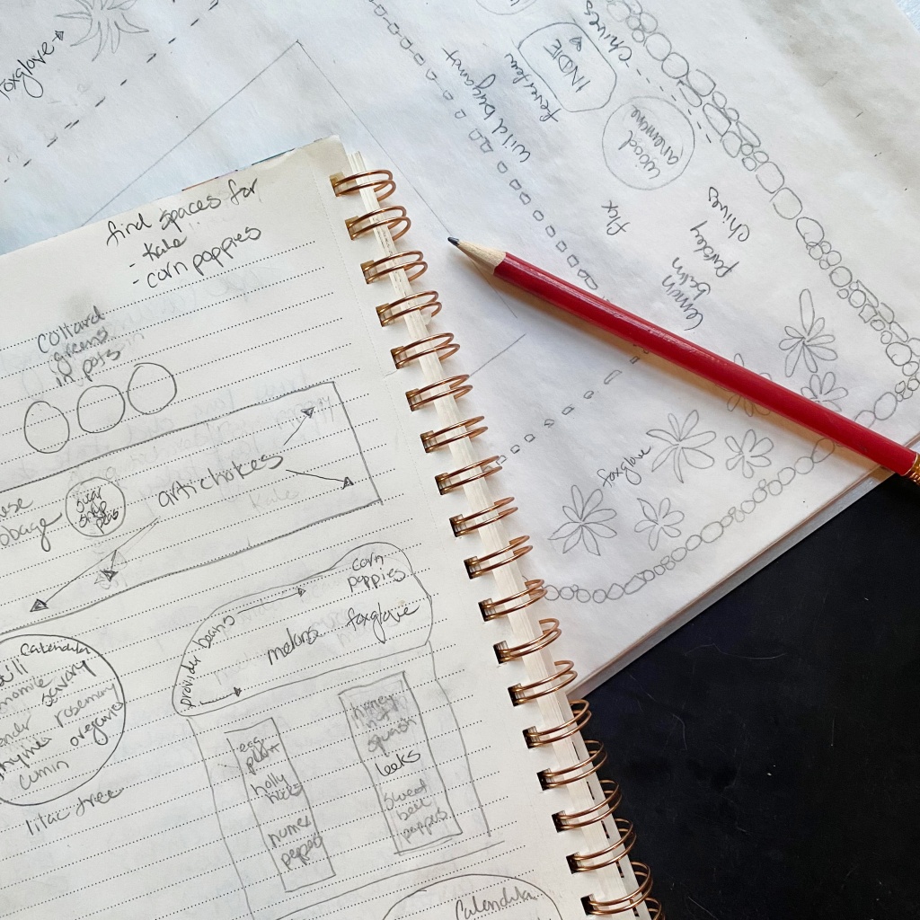 When it comes to the planting decisions of what goes where, I recommend sketching all this out on paper with a pencil. At this stage, there is a lot of penciling in and erasing out, second-guessing and revising, dreaming and deciding. Color, size, height, light, and soil requirements are all things to be considered as well as companion plant pairings and general overall garden aesthetic, plus any decorative items or accessories you may want to include. After months of fiddling on paper, my garden layout finally came together. Adelma can rest assured now. I have a plan.