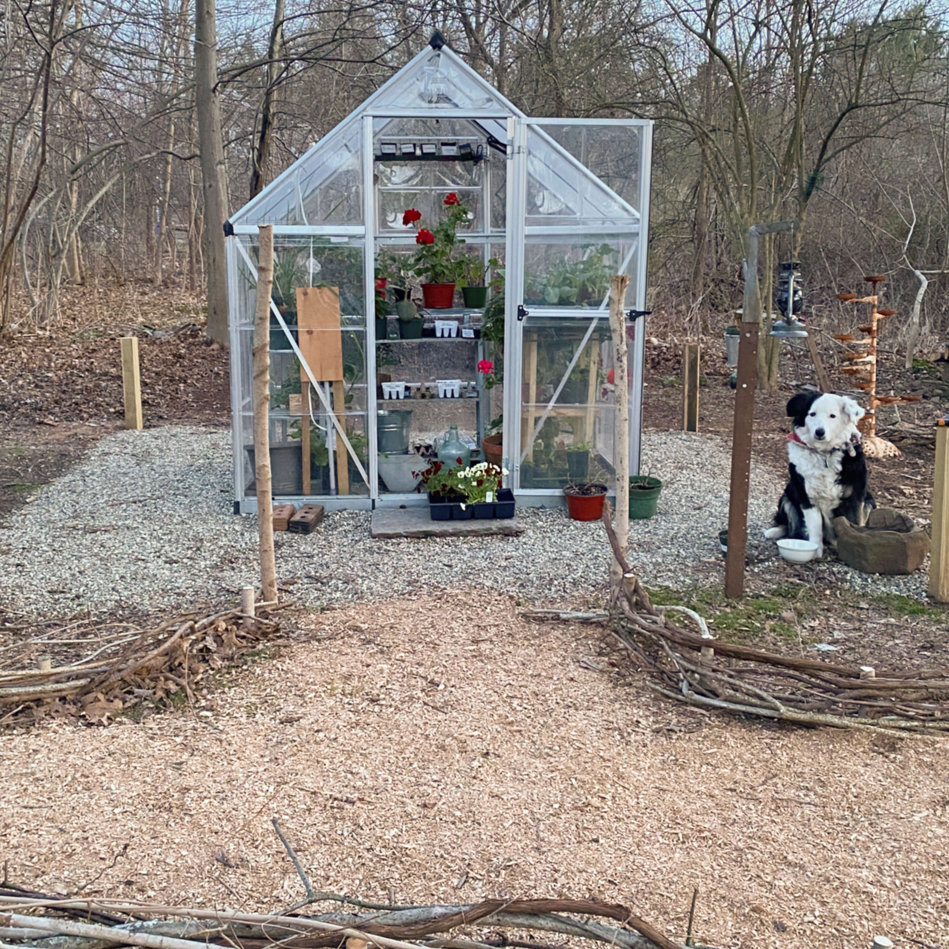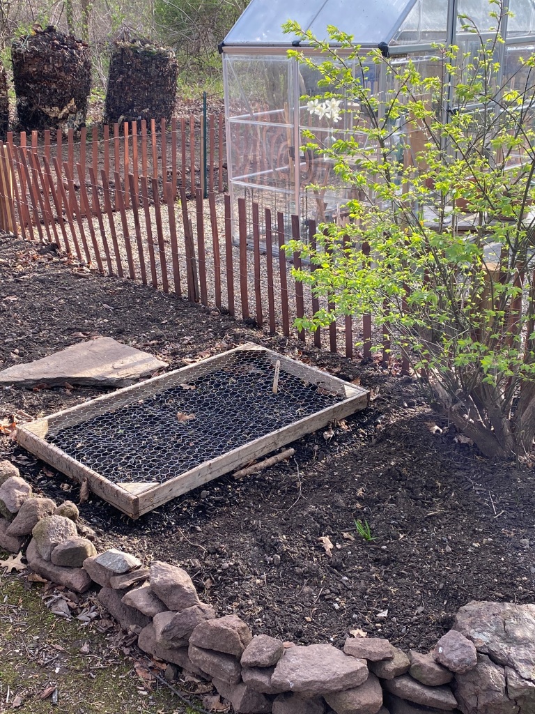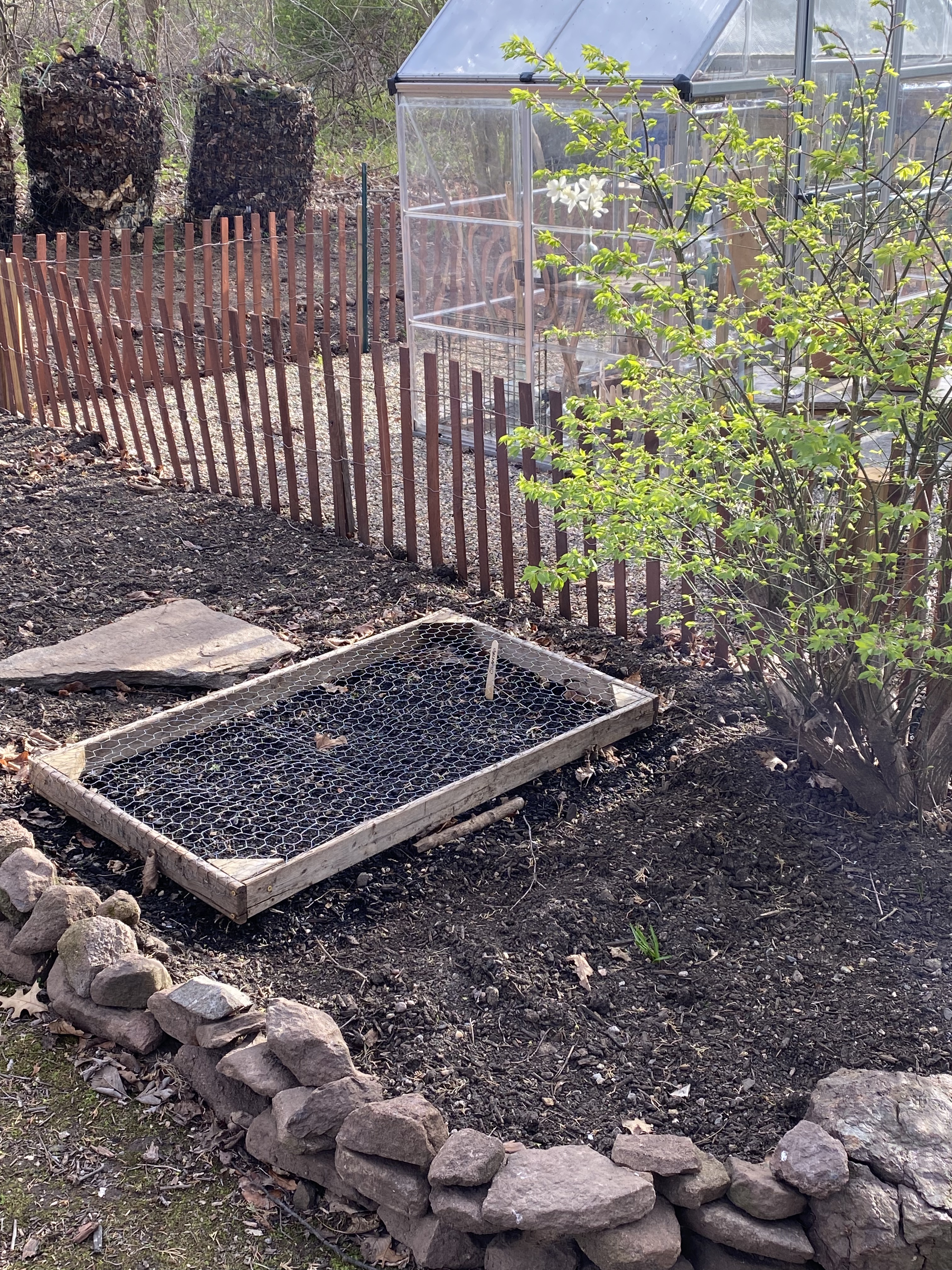 It’s so strange to think that exactly one year ago, on a warm spring evening, not unlike the ones we have been experiencing lately, long before we added the wooden fence around the greenhouse, we were experimenting with building a wattle fence. Indie kept us company all evening that night, watching over our endeavors, sitting pretty much in the same spot where she would come to be buried four months later. I like to think that she is still sitting there just like in the photo, watching over us and the greenhouse and the garden. If I learned anything about colonial gardening in America in the 17th and 18th centuries, it was that American garden design is rooted in nostalgia and a longing for what once was. Like Indie, the forget-me-nots will forever be woven into the fabric of the garden from here on out, self-seeding our little secret language of love and friendship year after year.