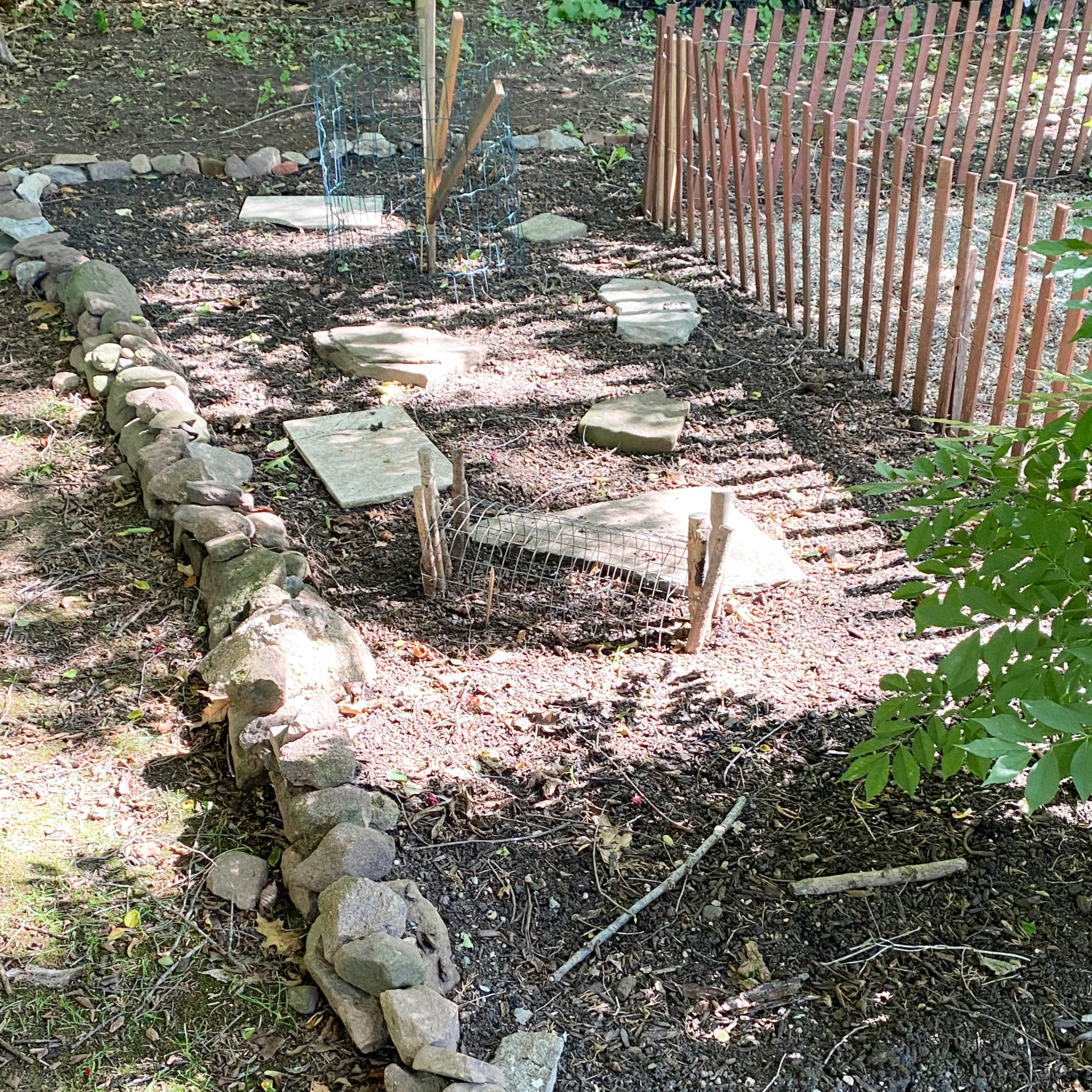 Once planted, every seedling got its own individually made wire cage for protection from rabbits, deer, squirrels, and other wild creatures that might find a newly planted herb garden especially enticing. For about a week, things were good. The herbs settled in and seemed to be happy in their new spots. The branches of the trees overhead were leafing out, and the sun was doing its dappled dance. The visions were coming to life.