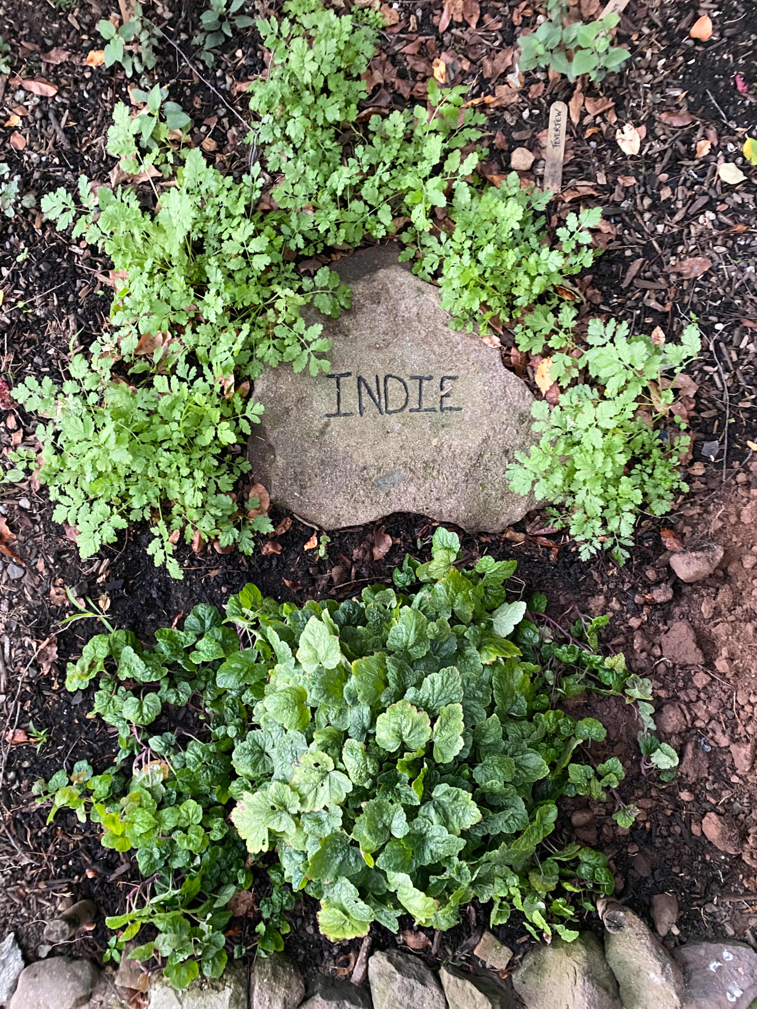 Back in January, penciled in around the anemone were pink and white echinacea, foxglove, lemon balm, parsley, mint, chives, and oregano. Now in reality, in September, Santiago’s inclusion in the garden inspired something different. A new vision. One that transformed this side of the greenhouse into a brand-new kind of garden altogether. Instead of an entire bed filled with herbs with a foxglove end cap, a new celebration garden was coming into light. One that represented joyful memories in the form of plants. One that captured the engaging spirits of our long friendships with a ten pound cat and the most enthusiastic pup on the planet. The foxglove, feverfew, and lemon balm will stay, but in place of adding other herbs, next spring, I’ll be adding flowers and shrubs suited to shade that carry reminders of Indie and Santiago. Instead of a bed for scented herbs, it will become a bed of sentiment, which is not unlike how colonial gardens were built in America in the first place.