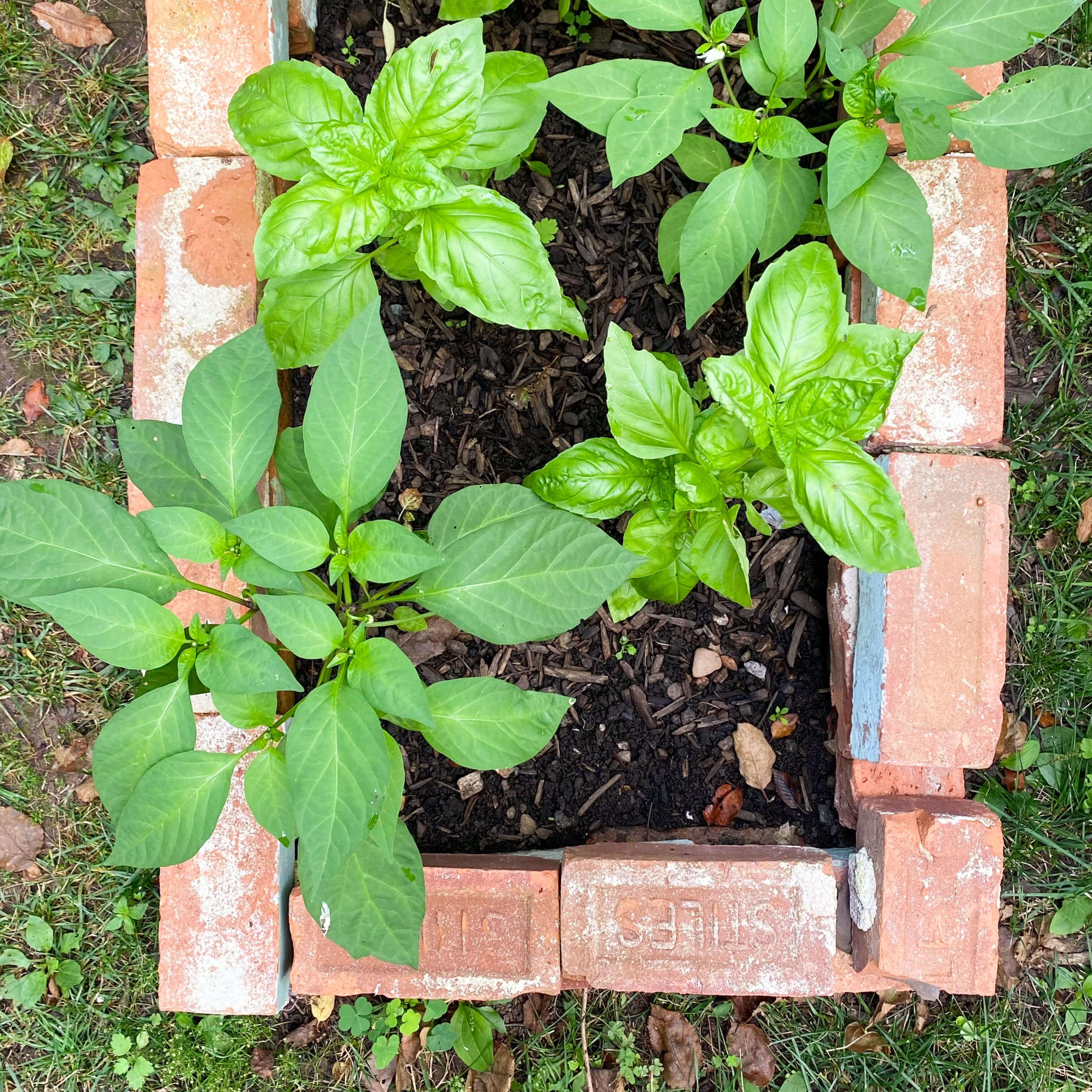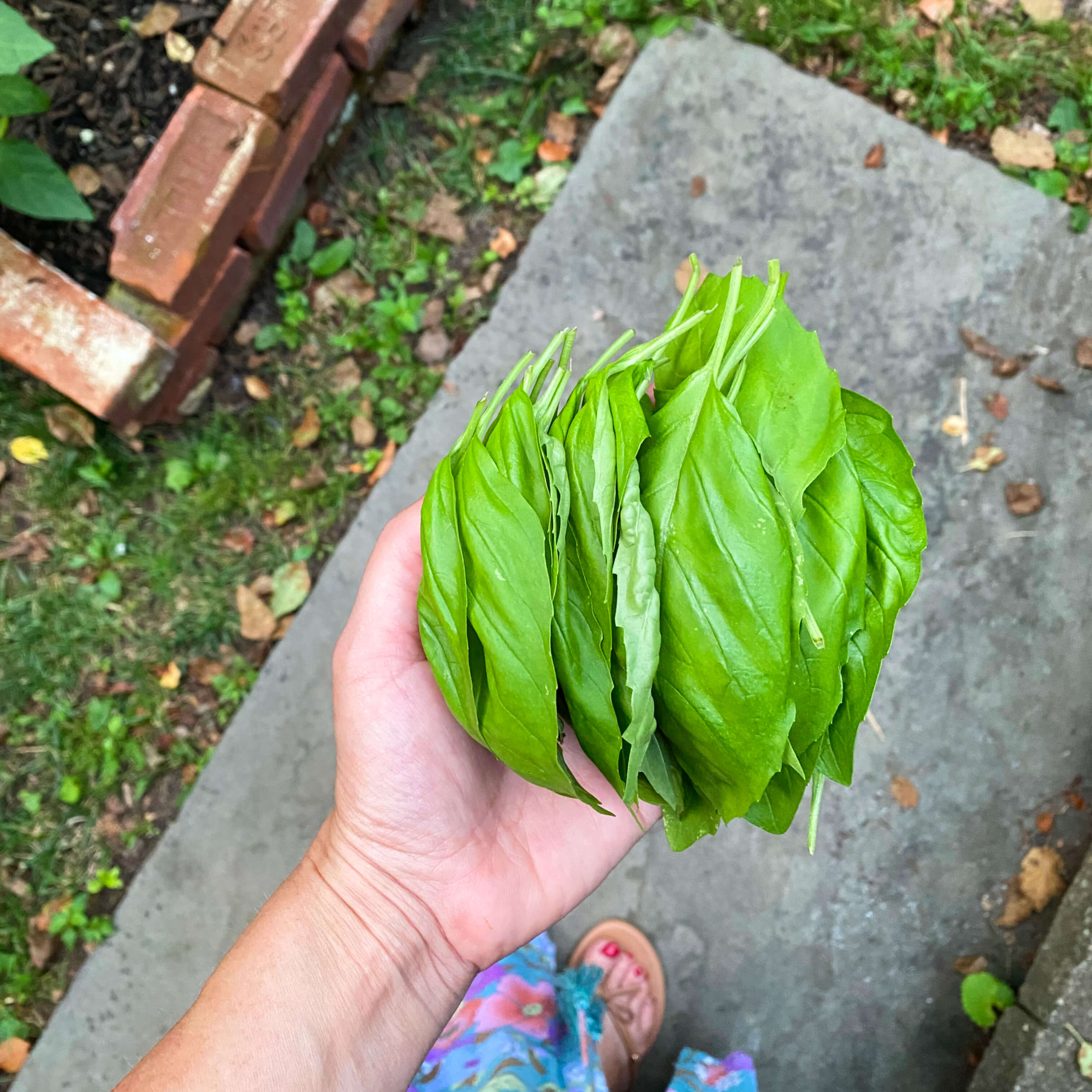 The last of the herb beds, located on the other end of the backyard from the greenhouse, contained basil and and another batch of nasturtiums. These beds were in partial shade last year, but turned out to be in full sun this year, due to a large tree that fell far back in the woods last autumn. That opened up a bit of a sun spot in the tree canopy overhead that was fortuitously in the direct path of our vegetable beds. Planting seedlings in spring when the trees were still bare, I had no idea this sun spot was going to be available, but it made it a banner year for everything growing in that section of the yard, basil included. Racing right alongside the pepper plants, the basil grew over two feet tall and produced leaves as big as my hand.