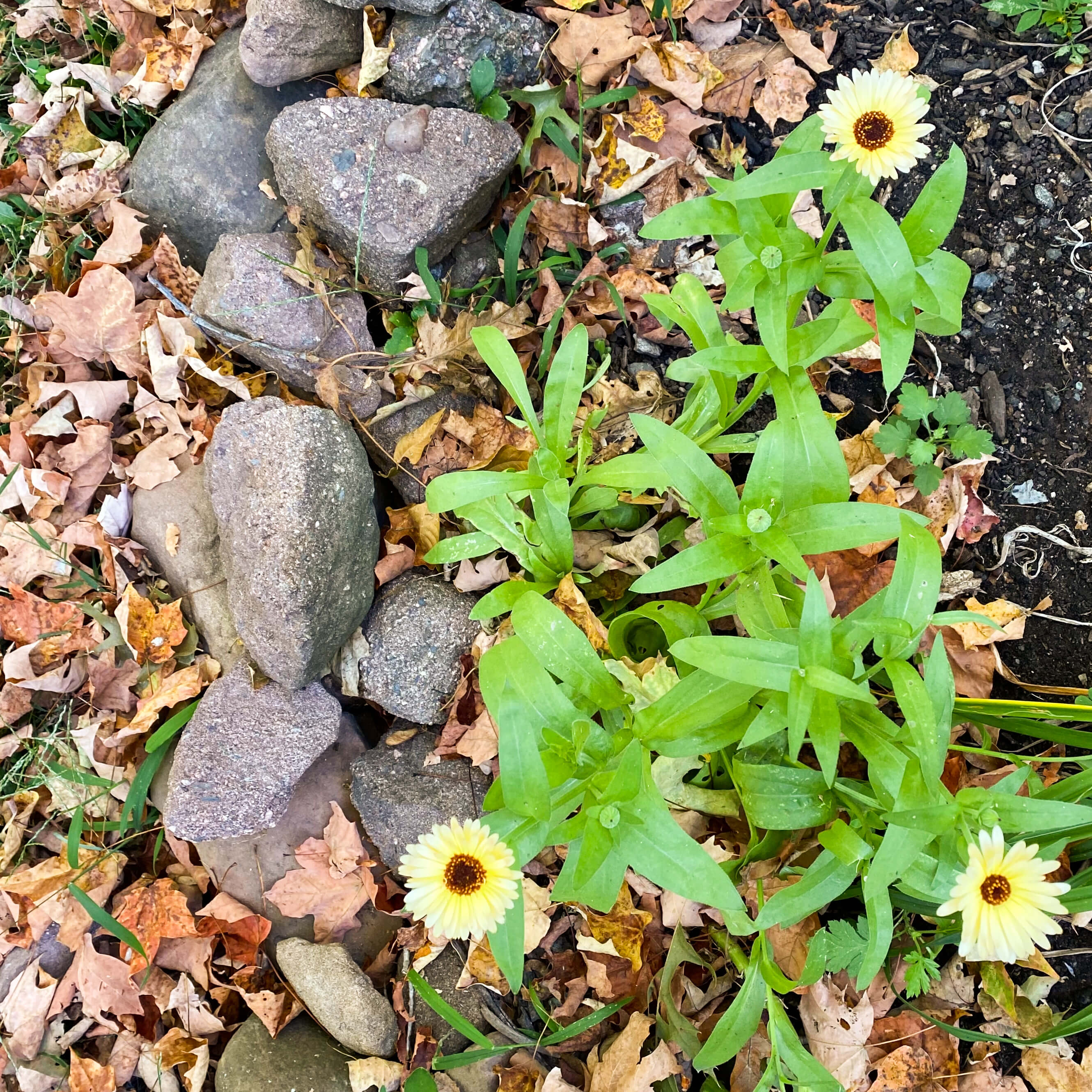 The calendula were the winners in this bed since they made it to full flower and kept flowering along with the cosmos and zinnia from June to November. The calendula formed little bushes of sticky leaves and multiple flower shoots. Had I planted about twice as many, they would have filled out all the bare spots in the bed completely. The yarrow and blackberry lily took the whole summer to establish themselves, but by September they both sported long leaves, so I’m hoping they’ll over winter with healthy vigor and really take off next year.