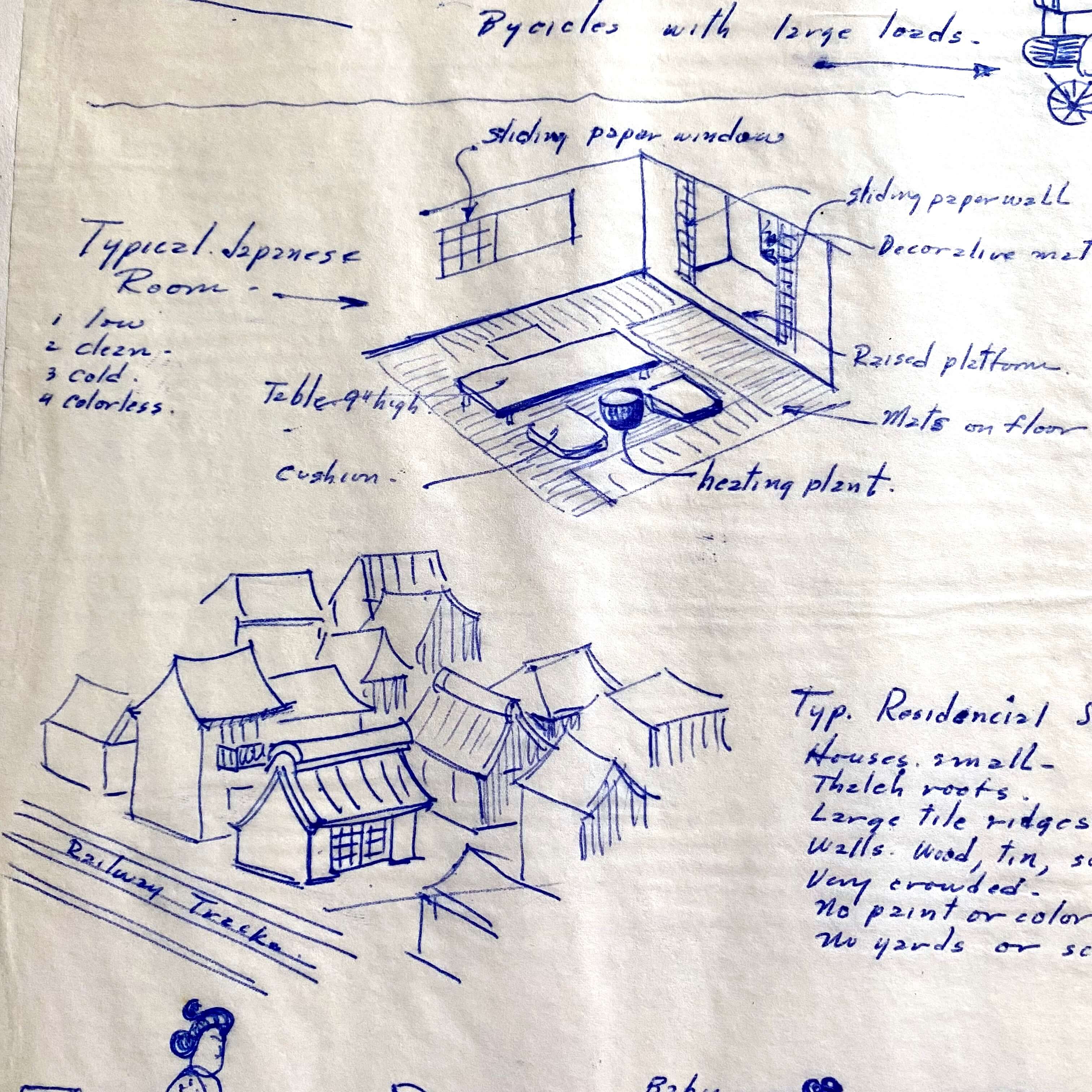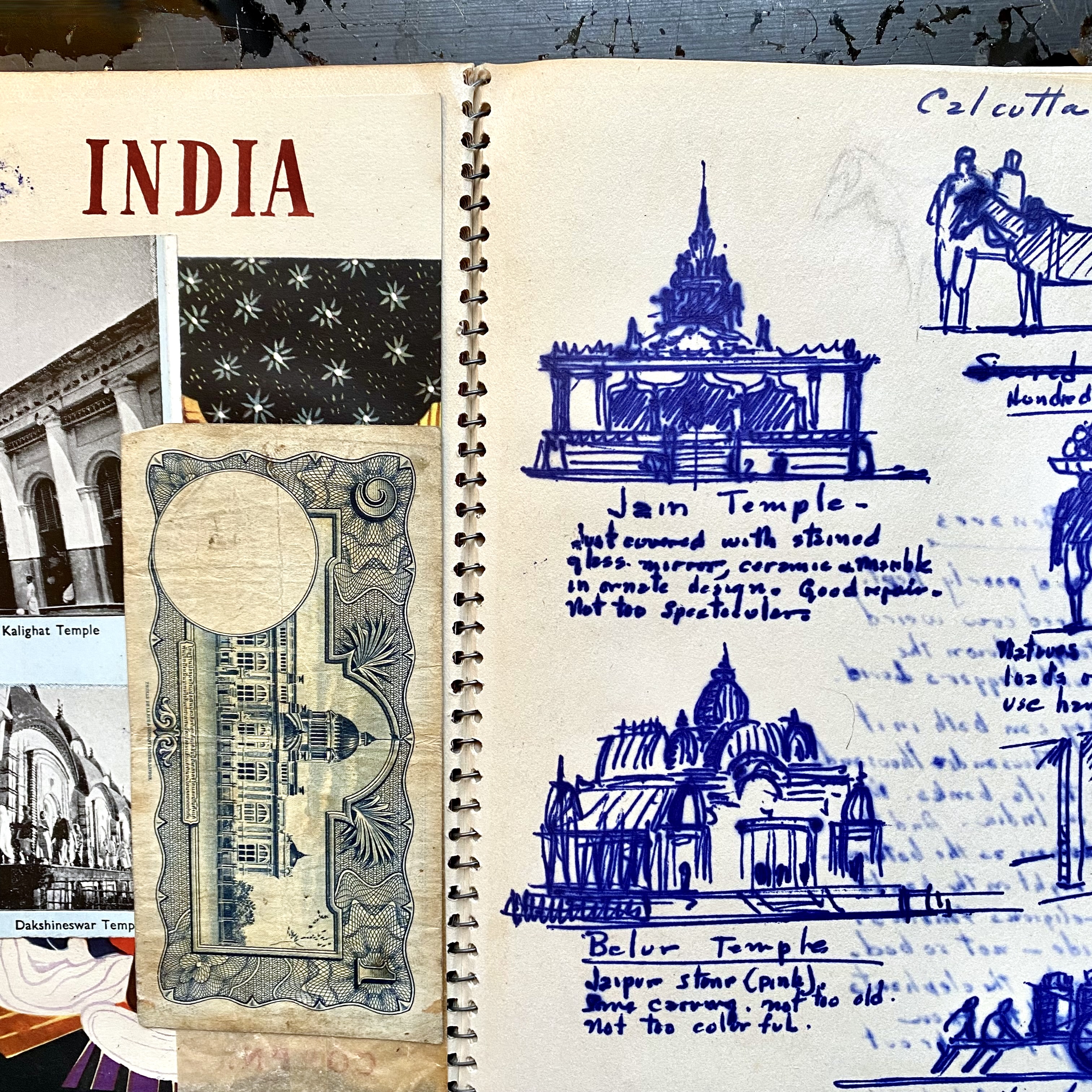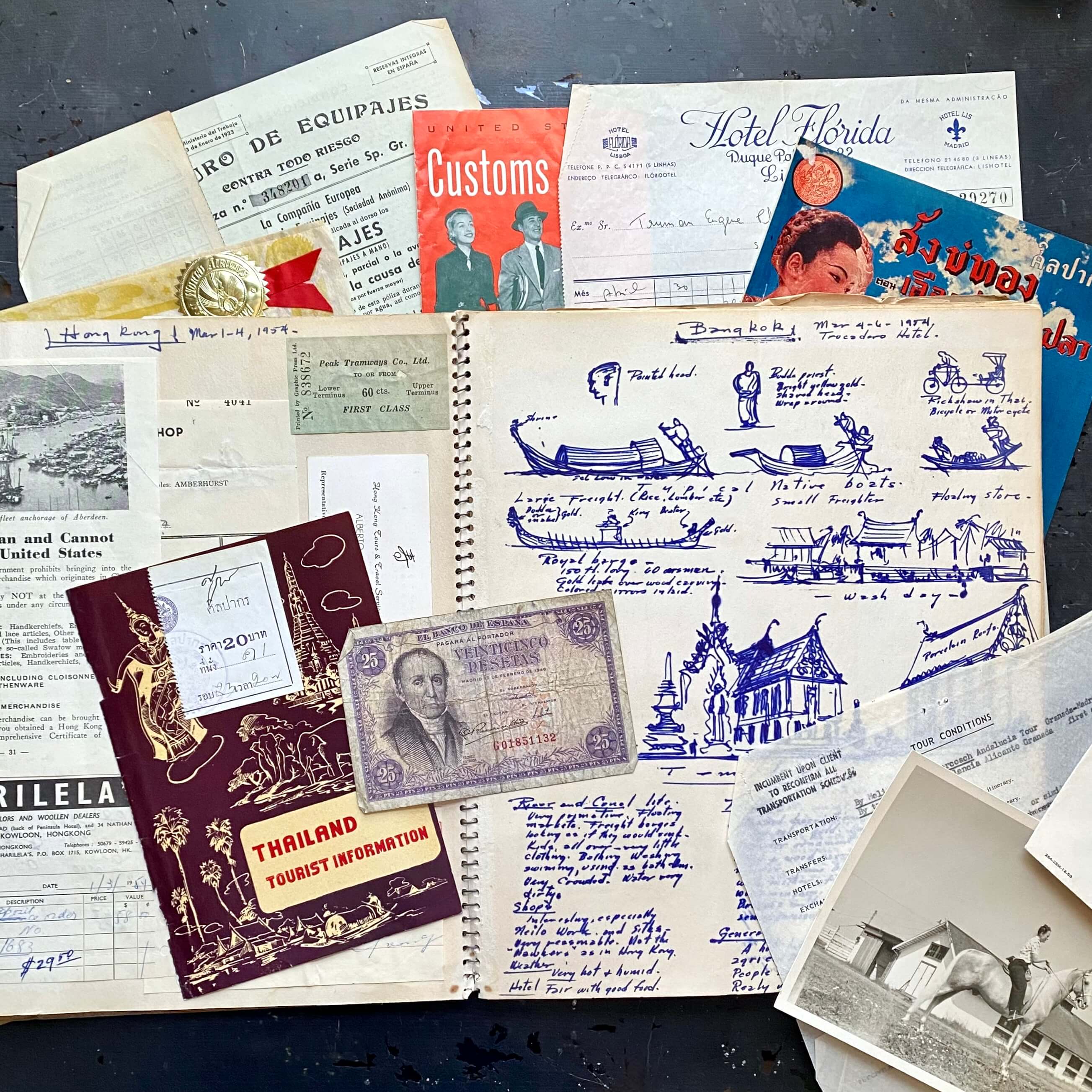 When the scrapbook came to me, I could feel the weight of the trip in its pages. In the way the blue ink and fervent handwriting swept across the paper. Across cities. Across cultures. In the way the pages sounded as they turned. How the tissue-thin receipts and airmail itineraries crinkled and crackled, bonded with 70-year-old paste that was brittle and slow to waken. I could feel the weight of the trip in the sketches of buildings, faces, cars, animals. In the way the book was carefully organized, documented, and arranged in linear fashion for future consultation and consideration. I could feel the weight of a story underneath this story.