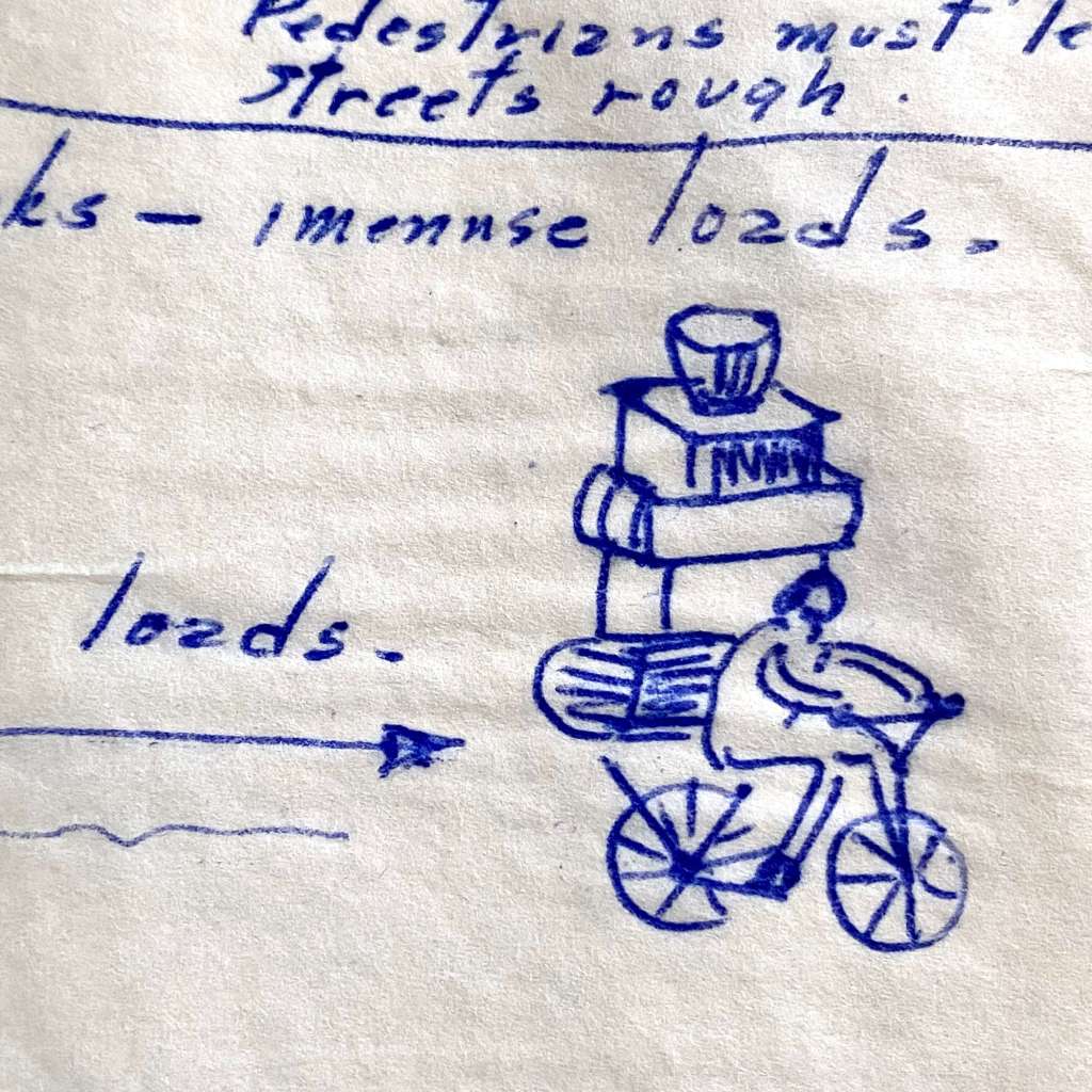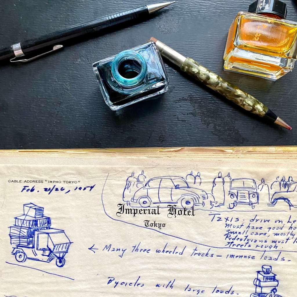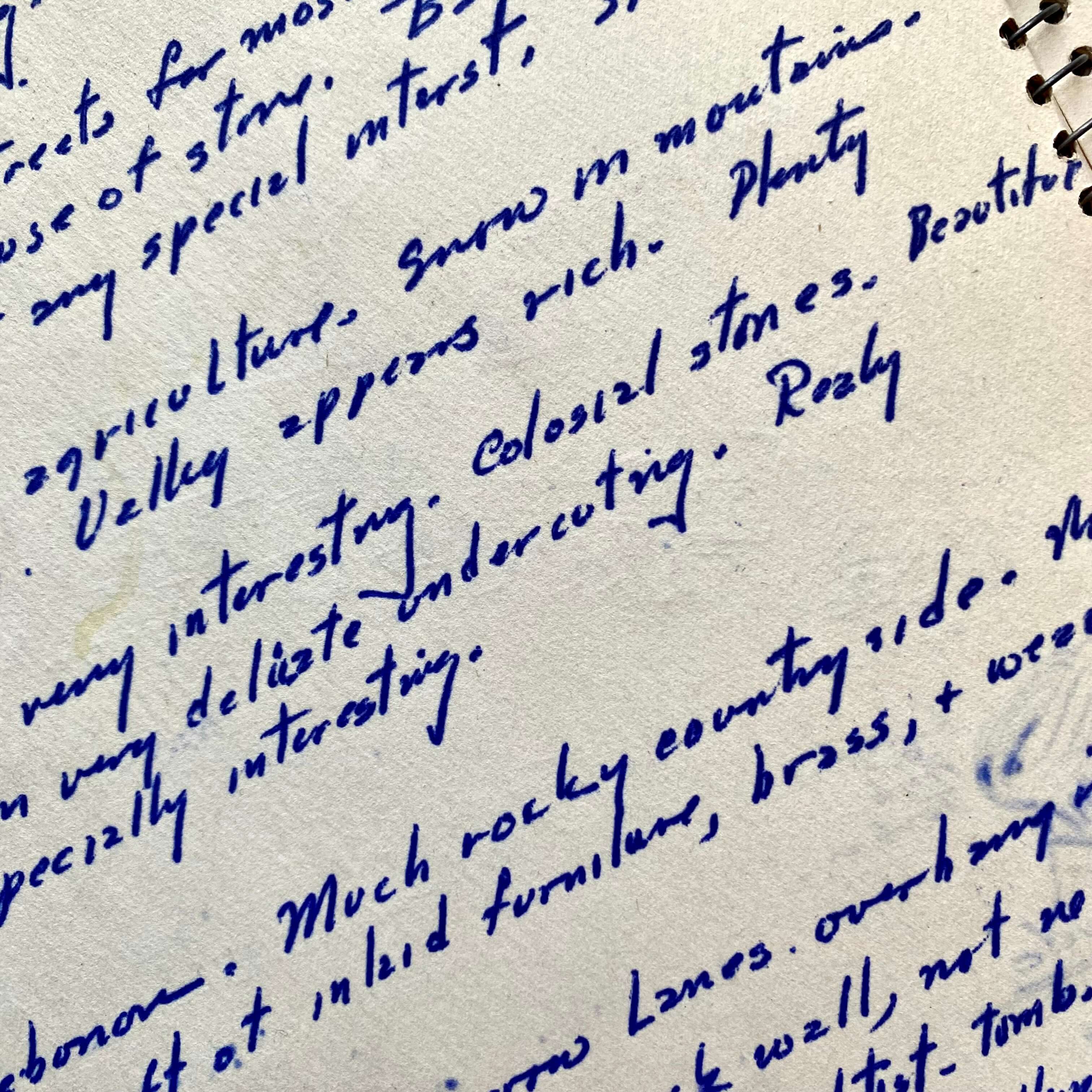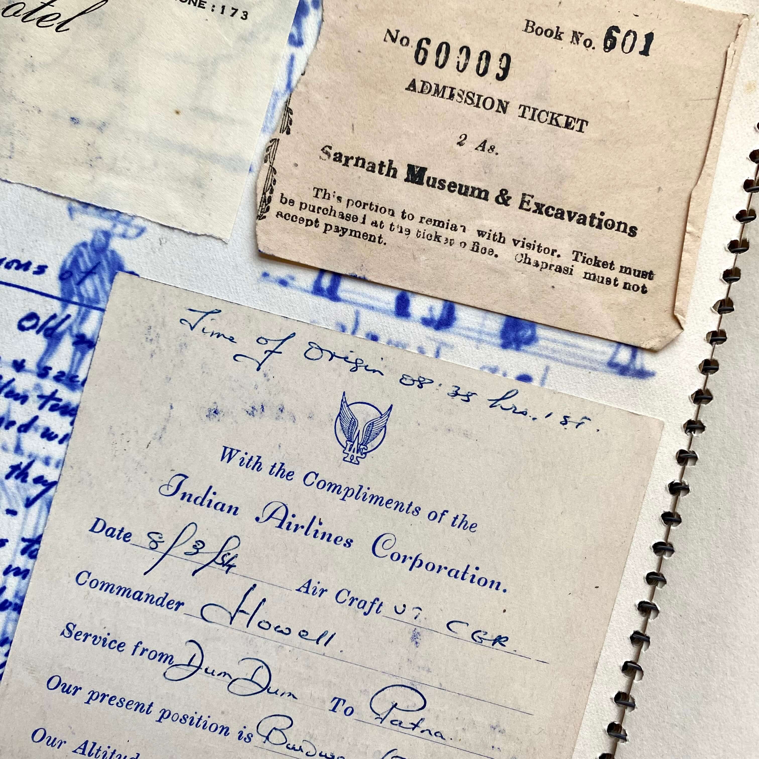 When the scrapbook came to me, I could feel the weight of the trip in its pages. In the way the blue ink and fervent handwriting swept across the paper. Across cities. Across cultures. In the way the pages sounded as they turned. How the tissue-thin receipts and airmail itineraries crinkled and crackled, bonded with 70-year-old paste that was brittle and slow to waken. I could feel the weight of the trip in the sketches of buildings, faces, cars, animals. In the way the book was carefully organized, documented, and arranged in linear fashion for future consultation and consideration. I could feel the weight of a story underneath this story.