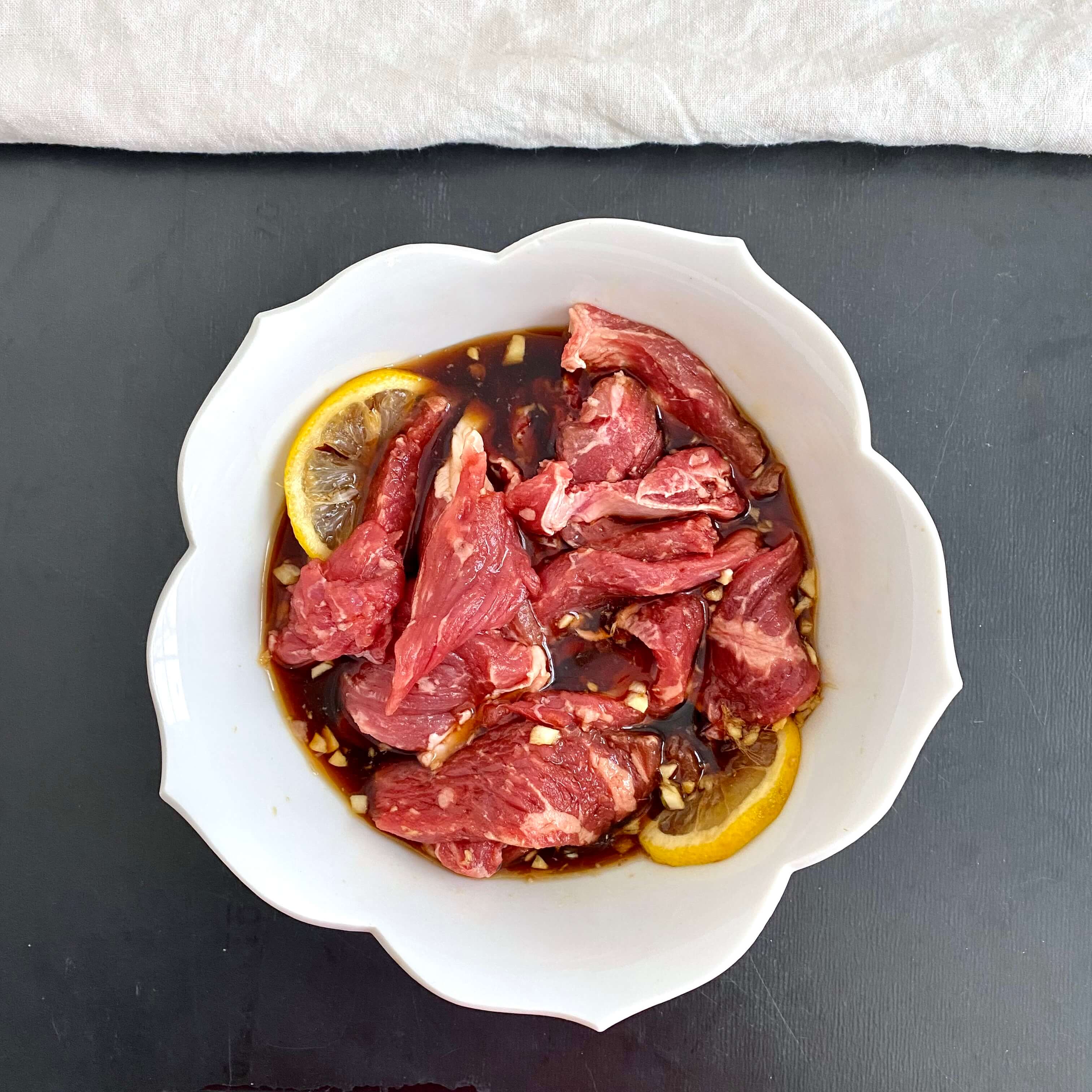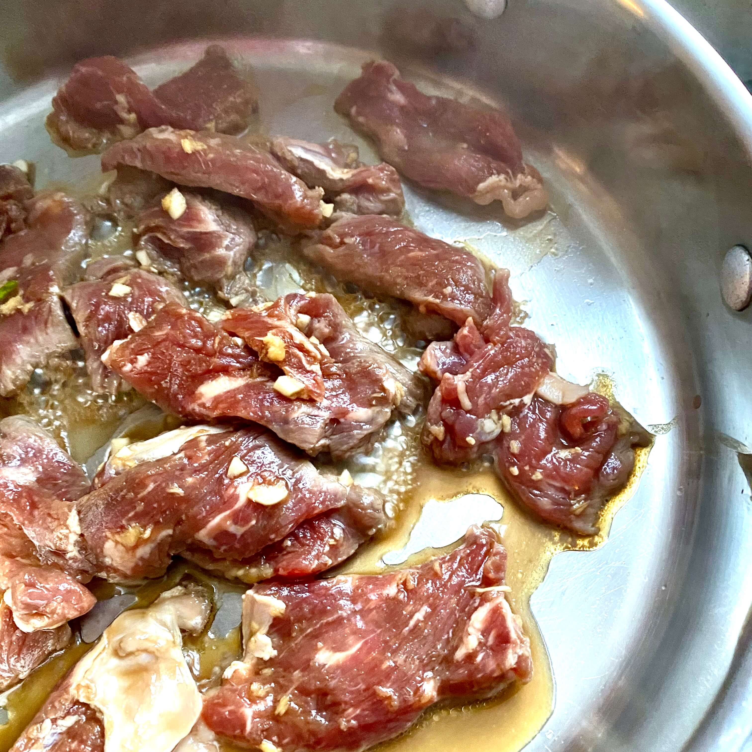 Marinate for 15 minutes or up to several hours.*Note: If you are marinating the beef for longer than 15 minutes, cover the bowl with plastic wrap and put it into the fridge. About 30 minutes before cooking, remove the bowl from the fridge to let the beef warm up to room temperature.