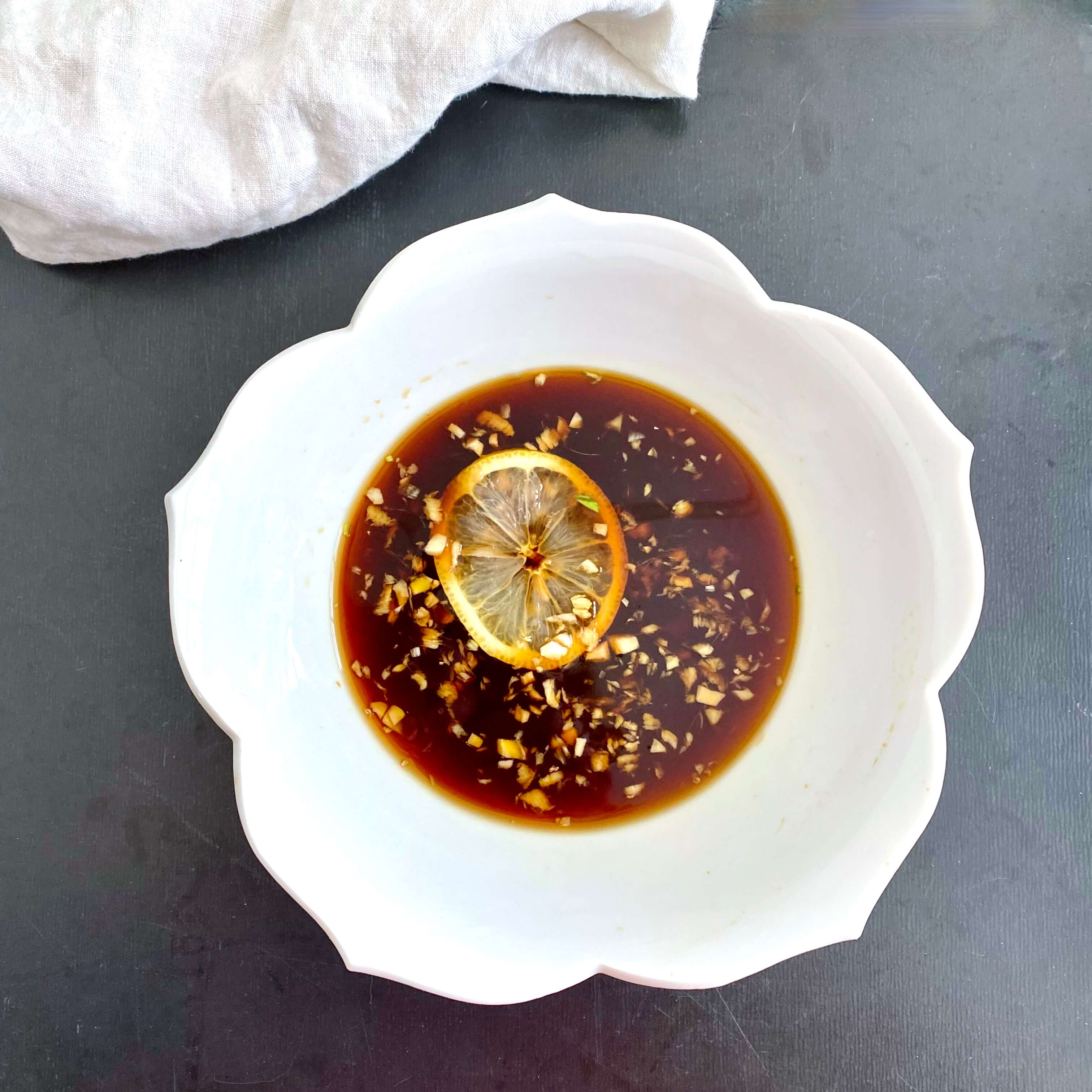 Combine the sake, soy sauce, sugar, ginger, garlic and lemon, in a medium bowl and stir until sugar dissolves.