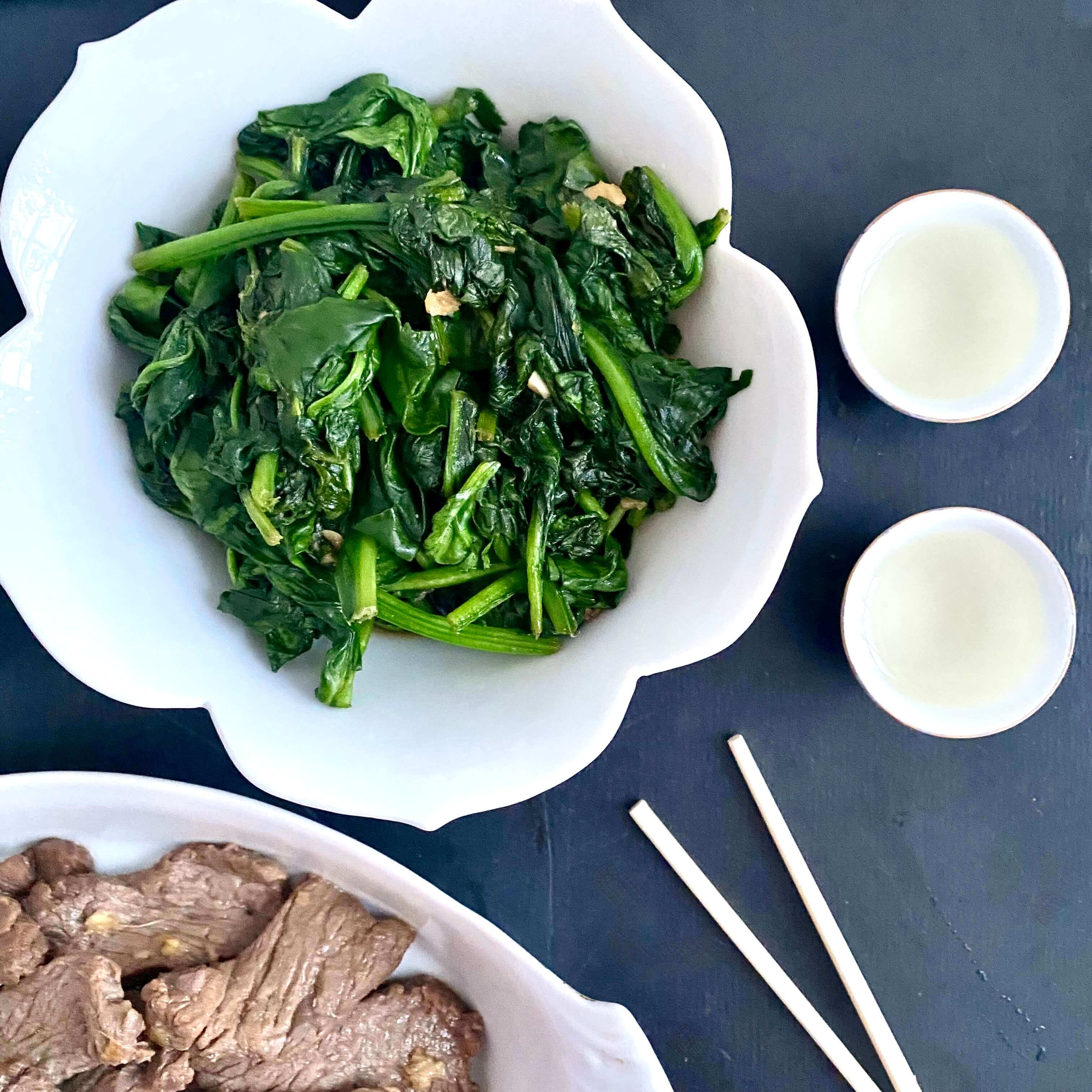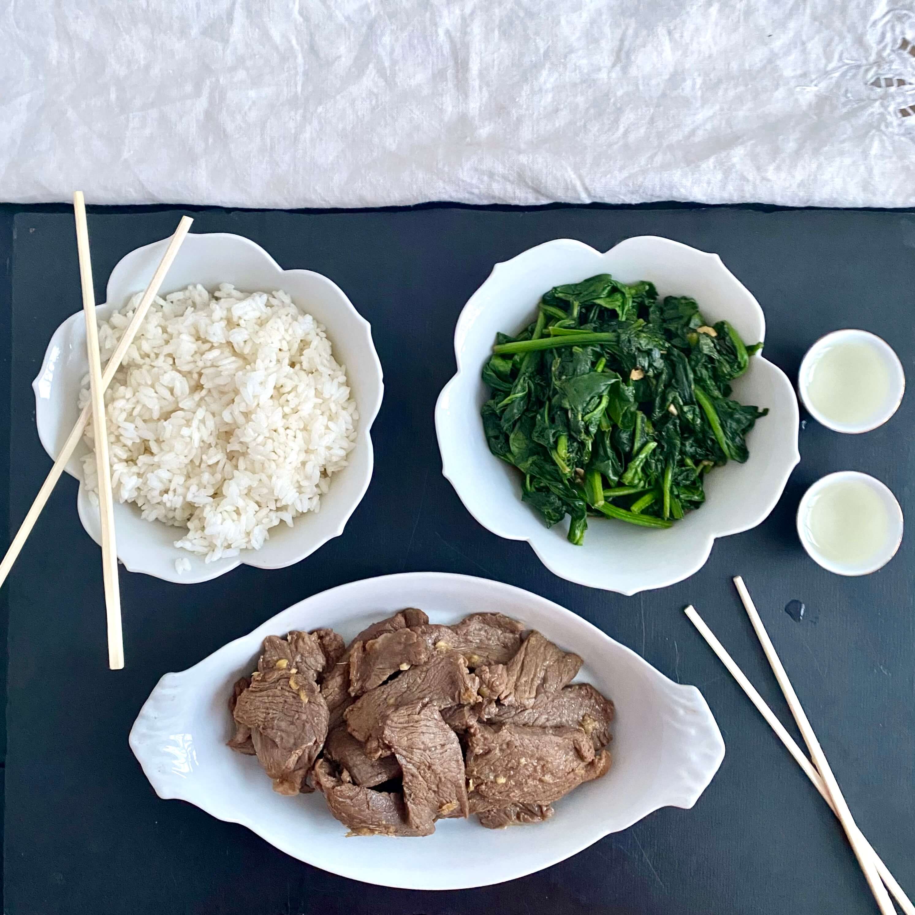 and serve immediately alongside the rice, spinach, and small servings of sake. For presentation, I recommend serving this meal family style on large platters. Or you can also serve it in individual bowls in a layered fashion, starting with rice at the bottom of the bowl, then spinach, then beef.