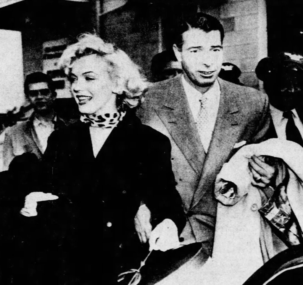 Marilyn & Joe leaving for the honeymoon stay at the Imperial Hotel, Tokyo. Photo courtesy of the San Bernardino County Sun, February 1954