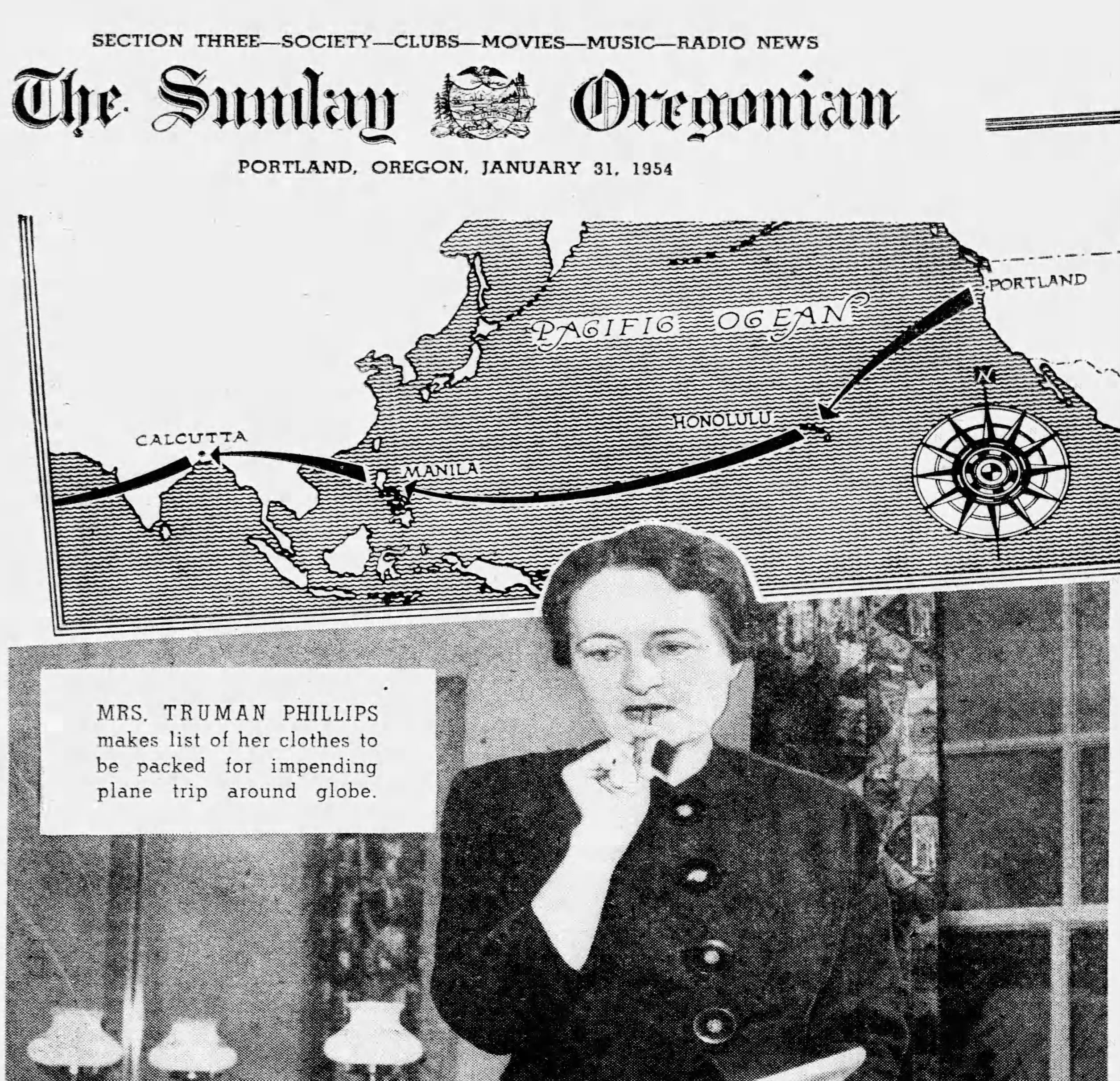 As is the fate of many women throughout history, there’s not much more info about Millie beyond that, with the exception of the newspaper article published in the January 31st, 1954 edition of The Sunday Oregonian. A full-page feature, complete with multiple photographs on the dynamics of how Millie and Truman were packing for their three-month-long international escapade, it turned out to be the perfect preface to the scrapbook. It detailed the clothing they were packing and how, and in what type of luggage. It mentioned the importance of each item’s weight and how that was both a critical and consequential factor in determining a well-packed bag. Photos included Truman washing a shirt in the sink, Millie fastening straps on a packed bag. Another set showed Truman fiddling with a movie camera he was bringing along, and Millie looking over a pile of clothes with her packing list in hand. It was such a personal piece, I thought for sure I would encounter at least one more follow-up article when Millie and Truman returned home to share how the trip went. But this was not the case. This pre-trip packing article was a one-time claim to fame, and Millie was never mentioned in the paper again until her obituary was printed in 1986.