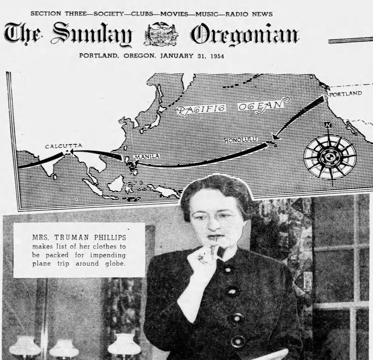 That was the only portrait of Millie in the book, and the only mention of her by actual name. Otherwise, it was “we” and she” in the travel notes. After doing some research online, I found a photo of Millie in a newspaper article connected to Truman, but it only referred to her as Mrs. Truman Phillips – no first name. Eventually, further research confirmed both her nickname, Millie, and her full maiden and married name, Mildred Strong Phillips.