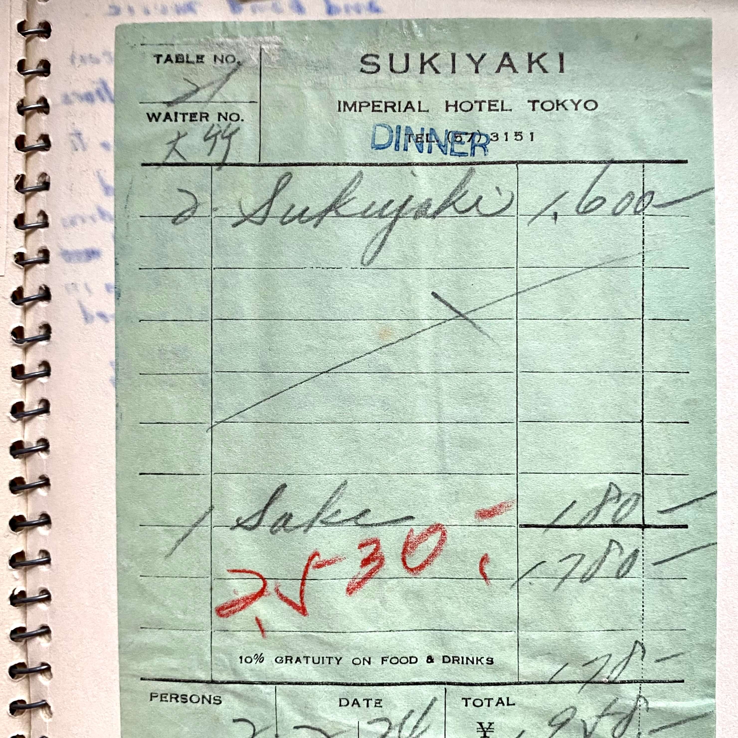 While there are no specific notes from Truman on their hotel stay, there is another receipt pasted under the hotel bill that documents a dinner at the hotel restaurant one night. There, Millie & Truman ordered sake and sukiyaki, a traditional beef and vegetable hot pot.