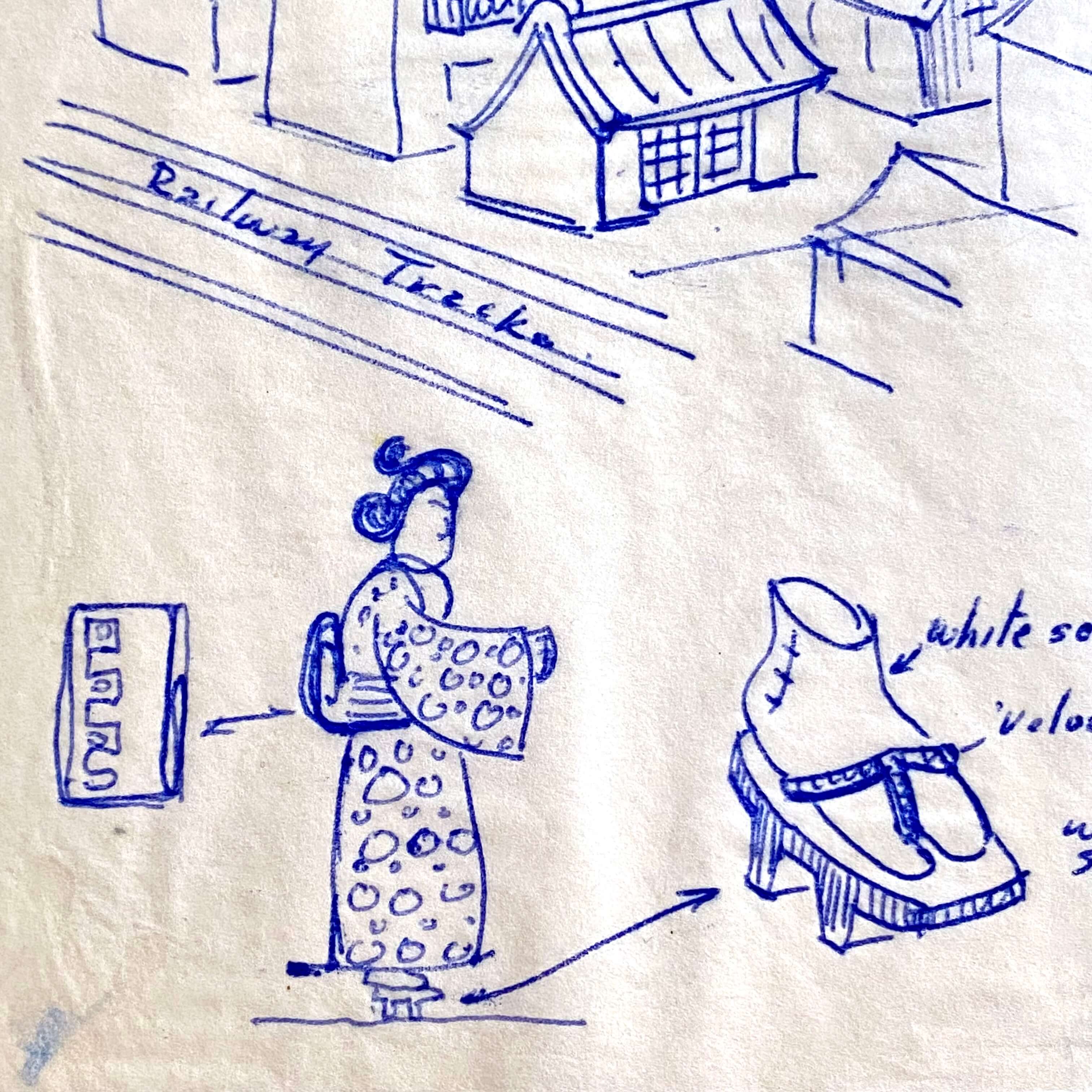 Although Candace didn’t know at the time, or actually ever for that matter, that these two people were named Millie and Truman, this is where the art of collecting takes an interesting and unique turn. Candace is a daydreamer with a wonderful imagination and a true passion and appreciation for Japanese culture. As she turned the pages of the scrapbook, she noted all the cities they visited. The finely detailed sketches of people and places, the pasted-in currency from each foreign country, and the paper ephemera that hinted at sites seen, people encountered, and menus, hotel tickets, and telegrams exchanged all along the way.