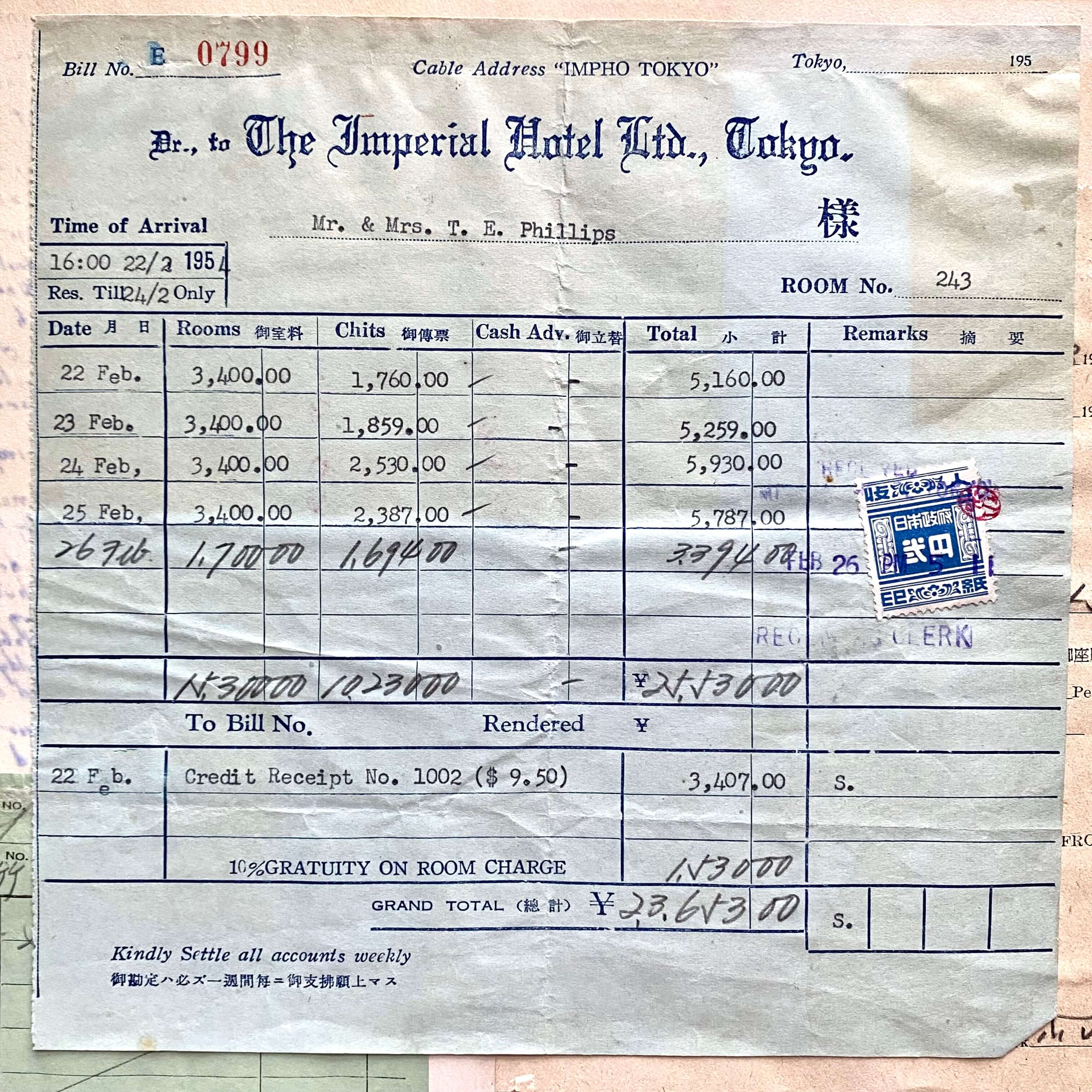 Still open today, the building was designed at various stages by architects Yuzrou Watanabe and Frank Lloyd Wright and has been altered over the course of a century to contend with earthquakes, modernization, and cultural shifts within the hospitality industry. In 1954, Truman and Millie stayed in room 243 for four nights at a total cost of 25, 530 yen (about $70.00 US dollars).