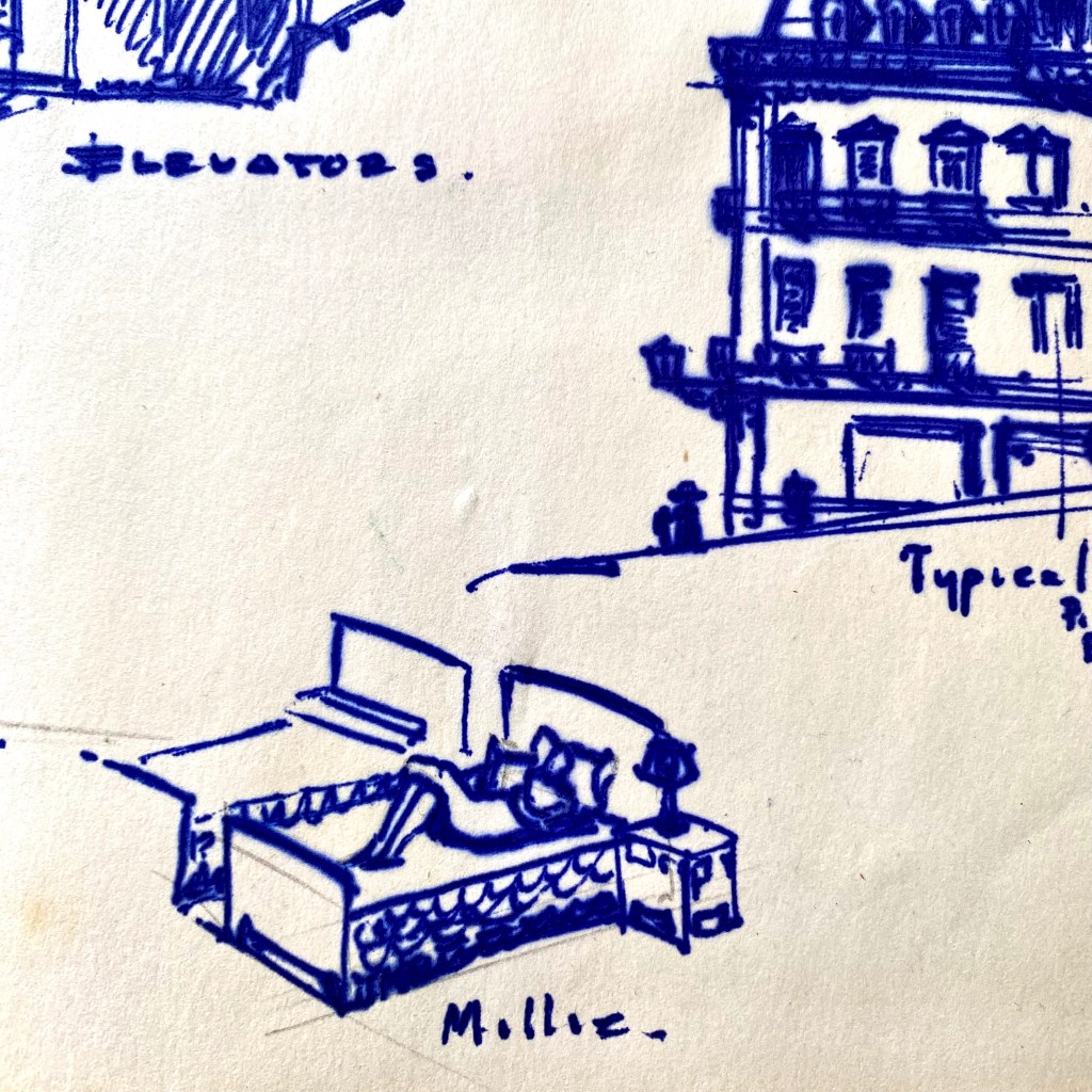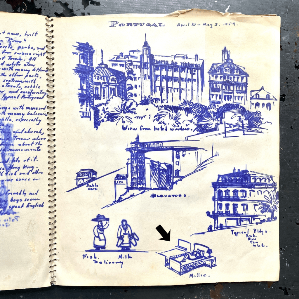 Millie’s name would be discovered later on in the scrapbook in a tiny drawing of her reading a book on a hotel bed in Portugal, as sketched by Truman.
