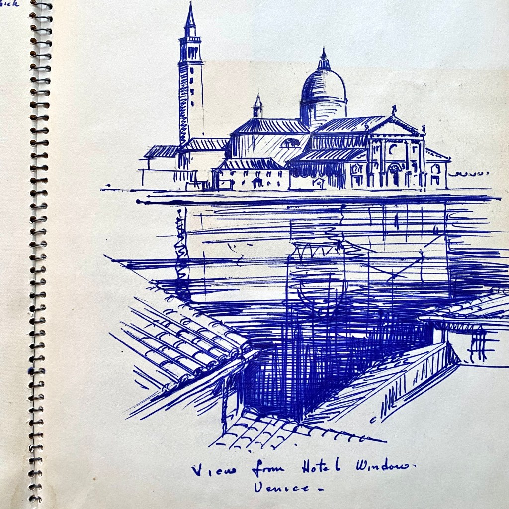 Truman’s sketch of Venice, Italy as seen through his hotel window.
