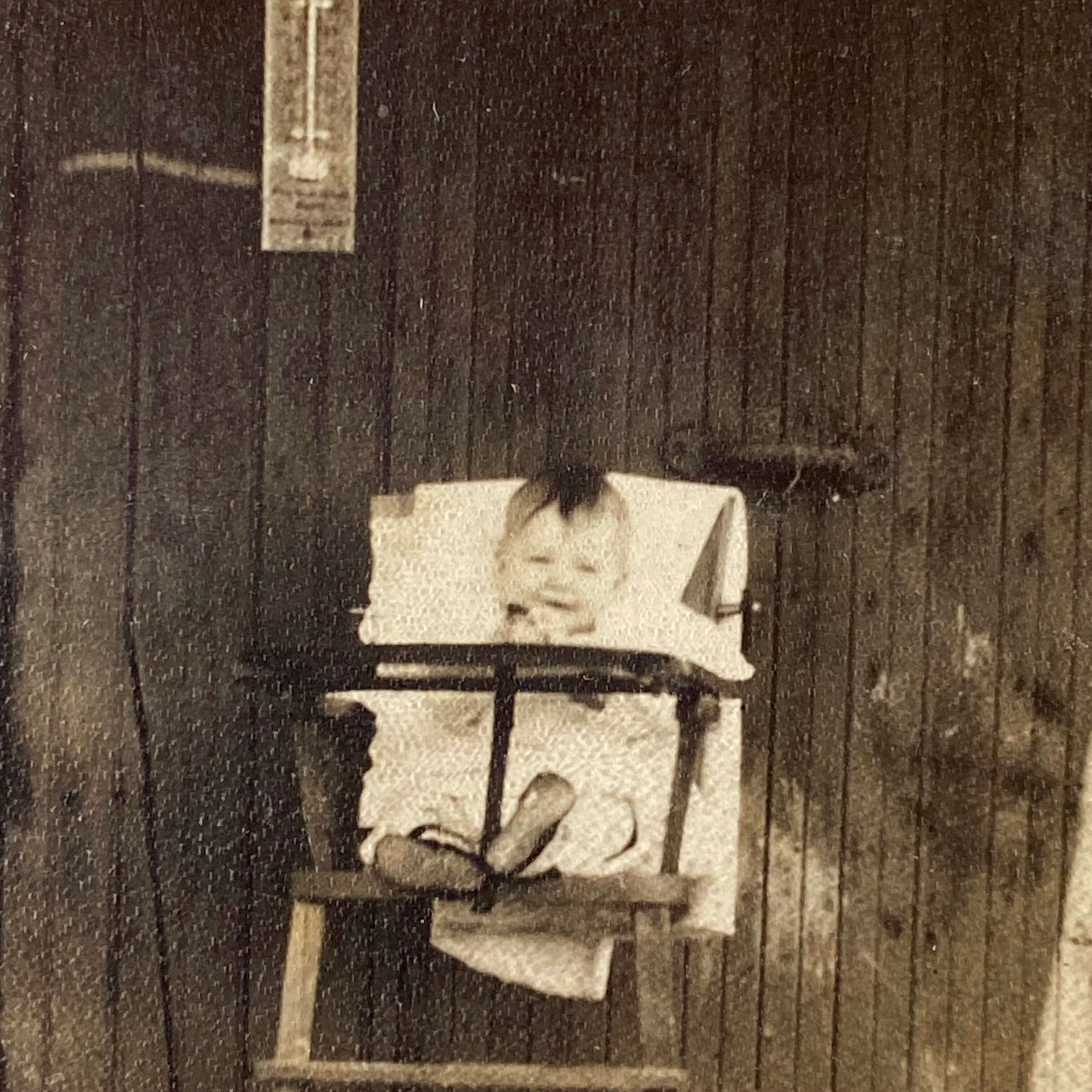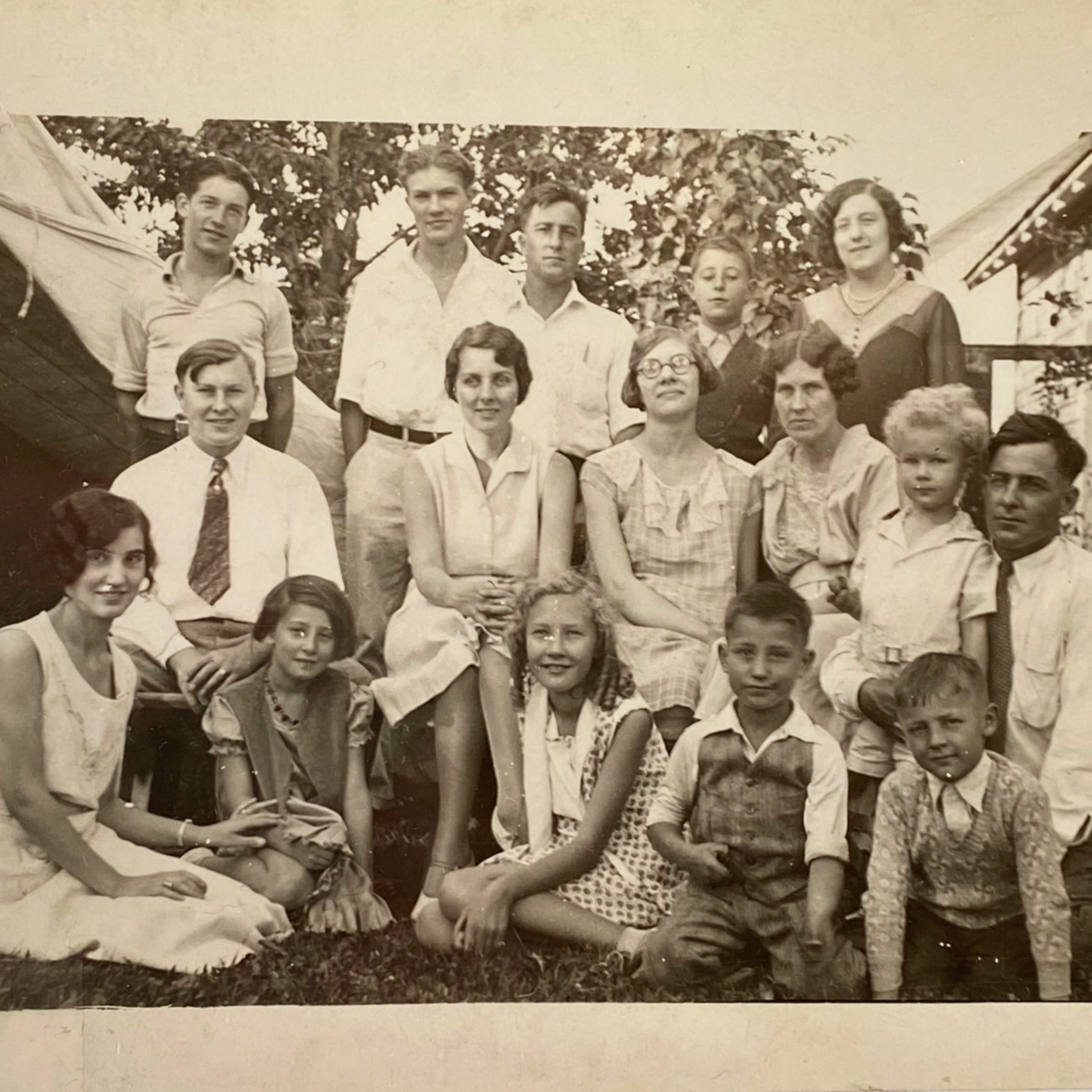 There are blurry candid shots and more formal, posed group shots. Several faces reappear in different settings. A building evolves in various stages of construction. There are men in fedora hats and women in fur coats. There’s a foal and a waterfall. A travel trailer. A canoe. A swing hanging from a laundry line. There’s a baby in a bath bucket and a woman sitting on the hood of a car.