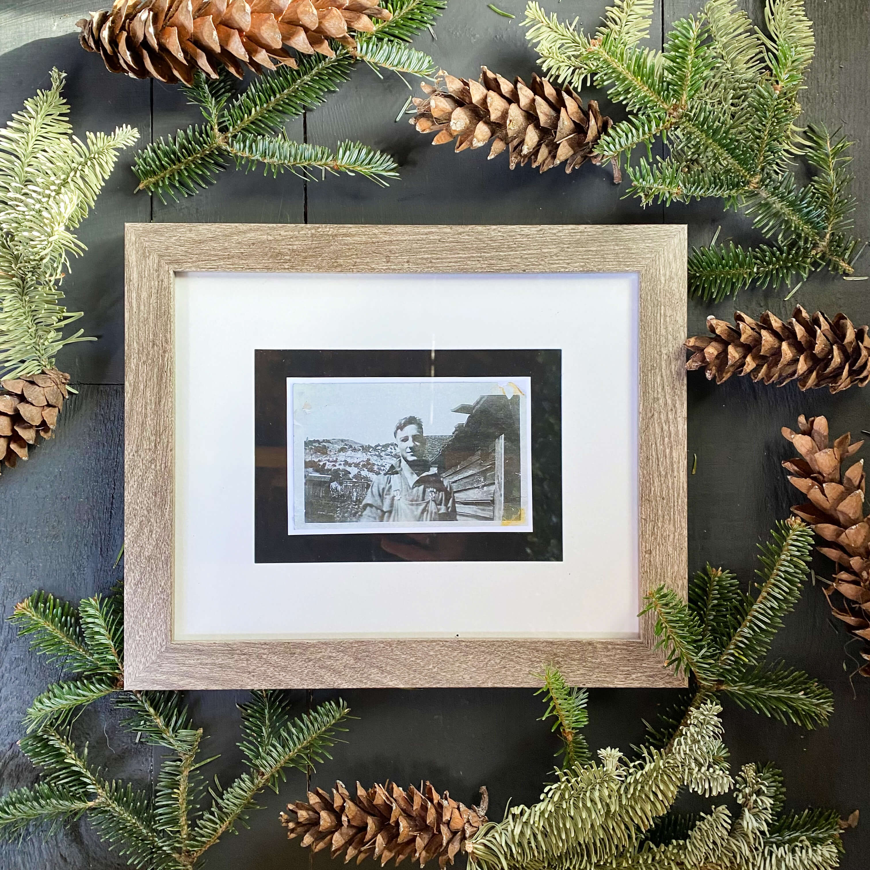 Before I left for Seattle, I had five copies made of one of the photos from the binder, so that I could frame them and give them to each of my nieces and my brother and sister. I chose a photograph of Bacon, newly married, age 24, where’s he looking straight at the camera. There are rolling hills in the background, part of a rustic building at his shoulder, a patch of corn growing next to a building behind him. He’s wearing his signature overalls. There’s a look of contentment on his face. A welcoming smile just about to bloom.