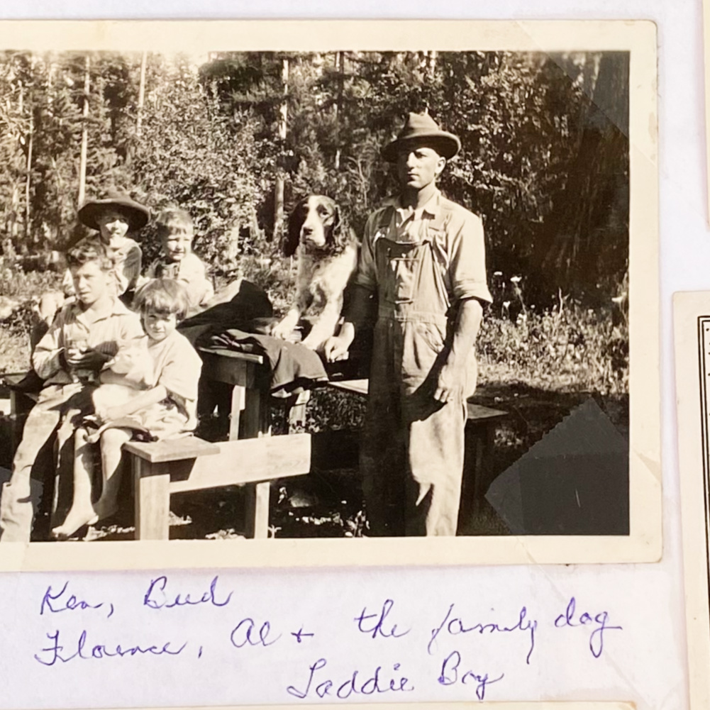 People are named Al… Bill… Bessie… Bud… Merwyn… Lou…Florence. Towns are labeled Garrison and Philipsburg. One photo refers to the “Minnesota Relatives.” A dog is named Laddie Boy.