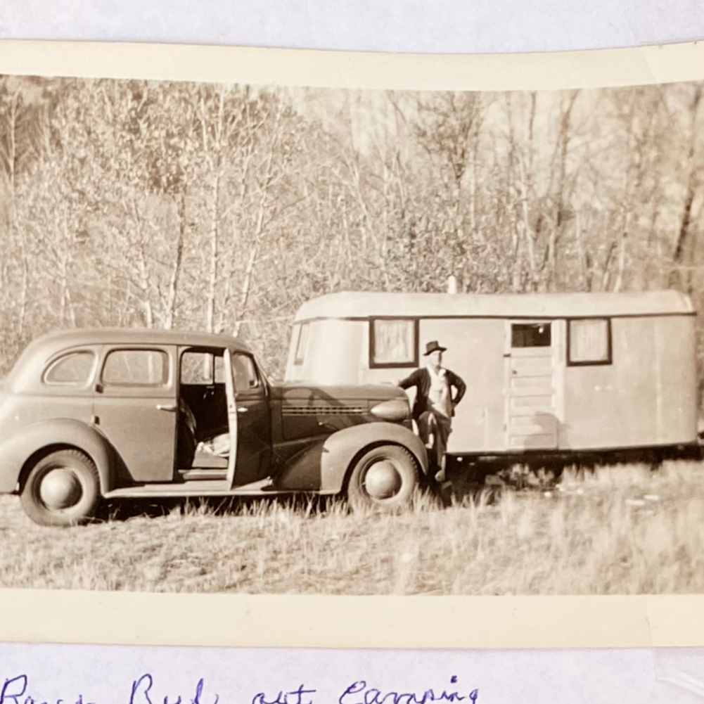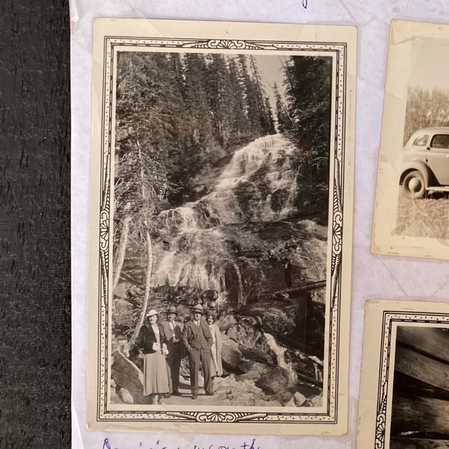 The waterfall is part of Skalkaho Pass, a point of interest In southwestern Montana that was mentioned in the photo album but misspelled. The building with everyone hanging out the window? That was the first house that Dolly and Bacon built from scratch with their own hands. The car with the motor home attached? That’s how Bacon and Dolly went camping. And the “Minnesota Relatives?” Those were Bacon’s brothers and sisters and their families visiting from Bacon’s home state.