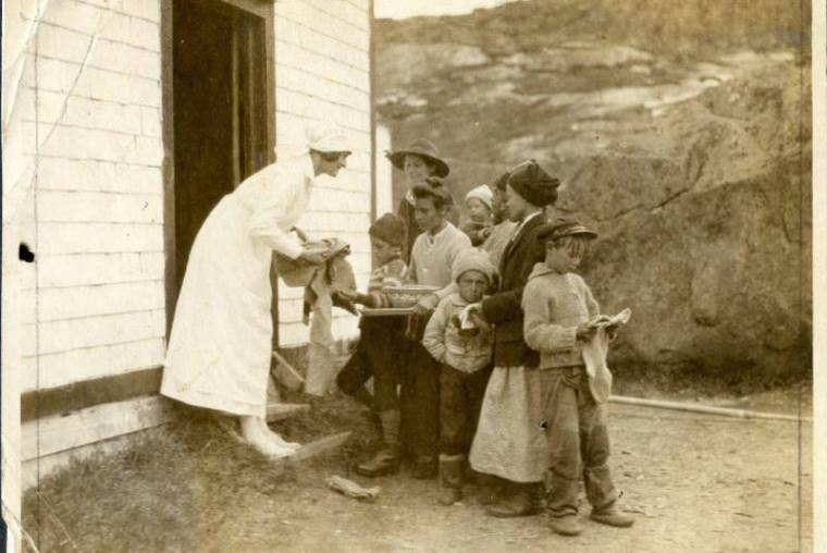 Trading became an active currency when money was scarce. Here, families trade household items for clothes from a Grenfell mission nurse. Photo courtesy of thetelegram.com