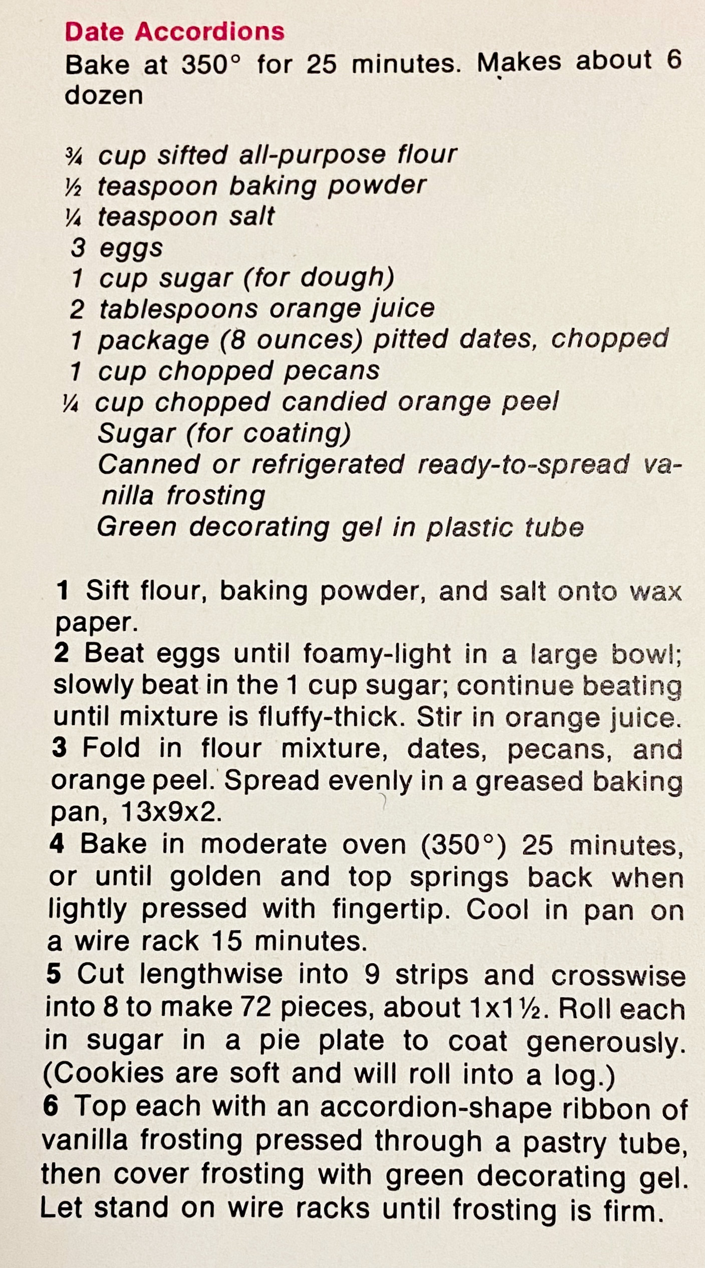 Today I need help finding a recipe that my 83 year old mother said she saw in a magazine (late 1950’s – early 1960’s ?). Ladies Home Journal or one of them at that time. The recipe was for a type of date and nut bar, that had a liquid like consistency that you put into a 9 x 13 pan, then cut into small rectangular bars, roll in table sugar, frost with white frosting, then zig zag some green gel on top. They were called “Date Accordions.” I have searched everywhere and cannot find anything close. We have been making these for years and last year my brother accidentally thru out her copy of the recipe. She is heartbroken!
