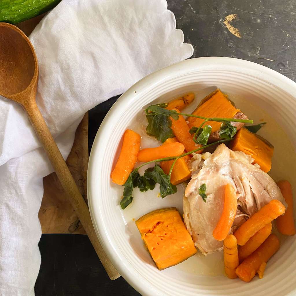With stew-like consistency, this dog-friendly recipe is full of comfort food flavors all bathed in a natural broth that forms when the water in the carrots and sweet potatoes mixes with the olive oil and the chicken fat. The hour-long steam makes the chicken fall off the bone and makes the vegetables so tender you can slice them with a butter knife.