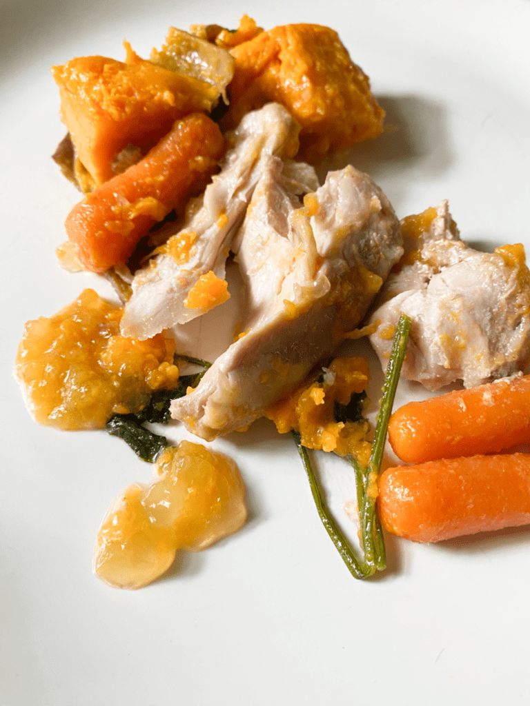 That is just a little example of how carefree this chicken recipe can be. The carrots, olive oil, and the chicken itself are mainstays, but the sweet potatoes can be swapped out for butternut squash, red potatoes, broccoli, cauliflower, cabbage, pumpkin, celery, beets. Just avoid adding any onions, garlic, or citrus fruits – three types of food that also seem like they might be natural companions to this meal, but are actually toxic to dogs. If you are interested in more possibilities to add in or swap out be sure to check the lists of other approved dog-friendly foods in the previous two posts here and here.