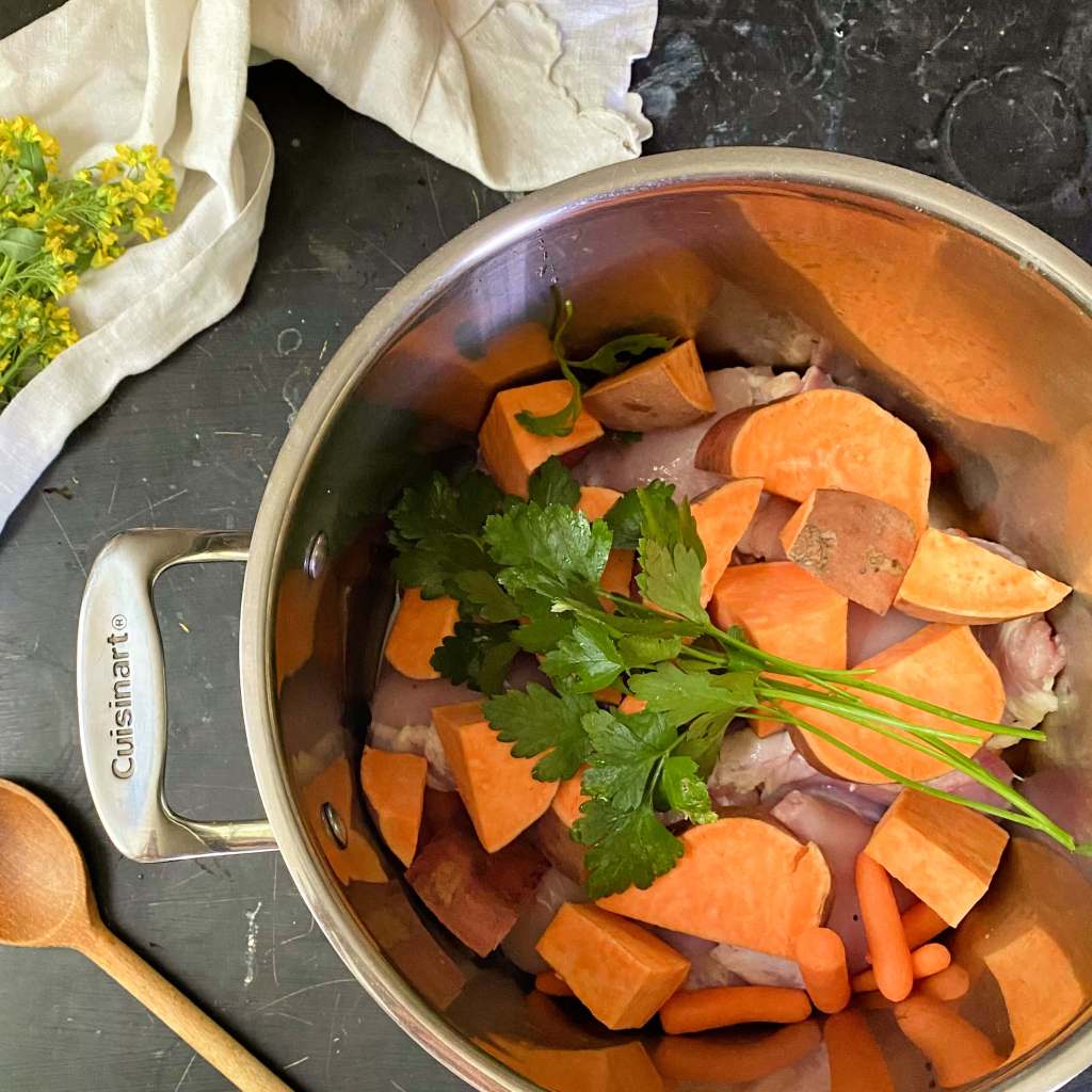 All the proportions discussed so far are based on Indie’s medium 55lb. frame. If you are making this recipe for a small breed dog like a chihuahua or a bichon, you can certainly swap out the thighs for smaller cuts like chicken tenders or thin-cut chicken breasts. If you decide to use either of those, simply adjust the cooking process by starting with the layer of carrots first after you add the olive oil, then add the chicken, salt and sweet potato layers. That way the chicken won’t get stuck to the bottom of the pot.