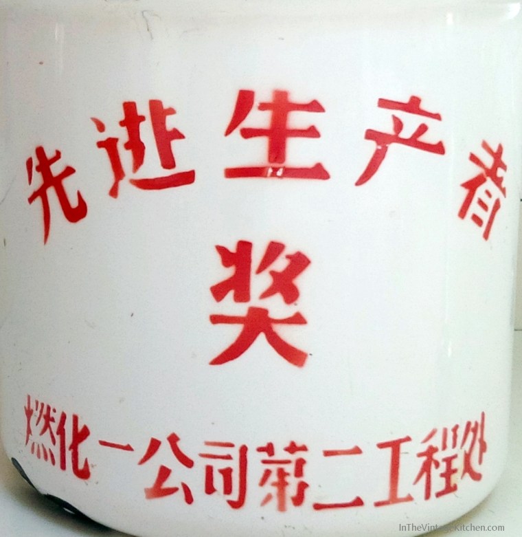 In April, we posed the question…how many people does it take to translate a mug? We were up to four at that point with two more possibilities waiting in the wings of email communication. The mug in question was a vintage 1950s enamelware-covered cup made by the Peacock Enamelware Factory in Tianjin, China.