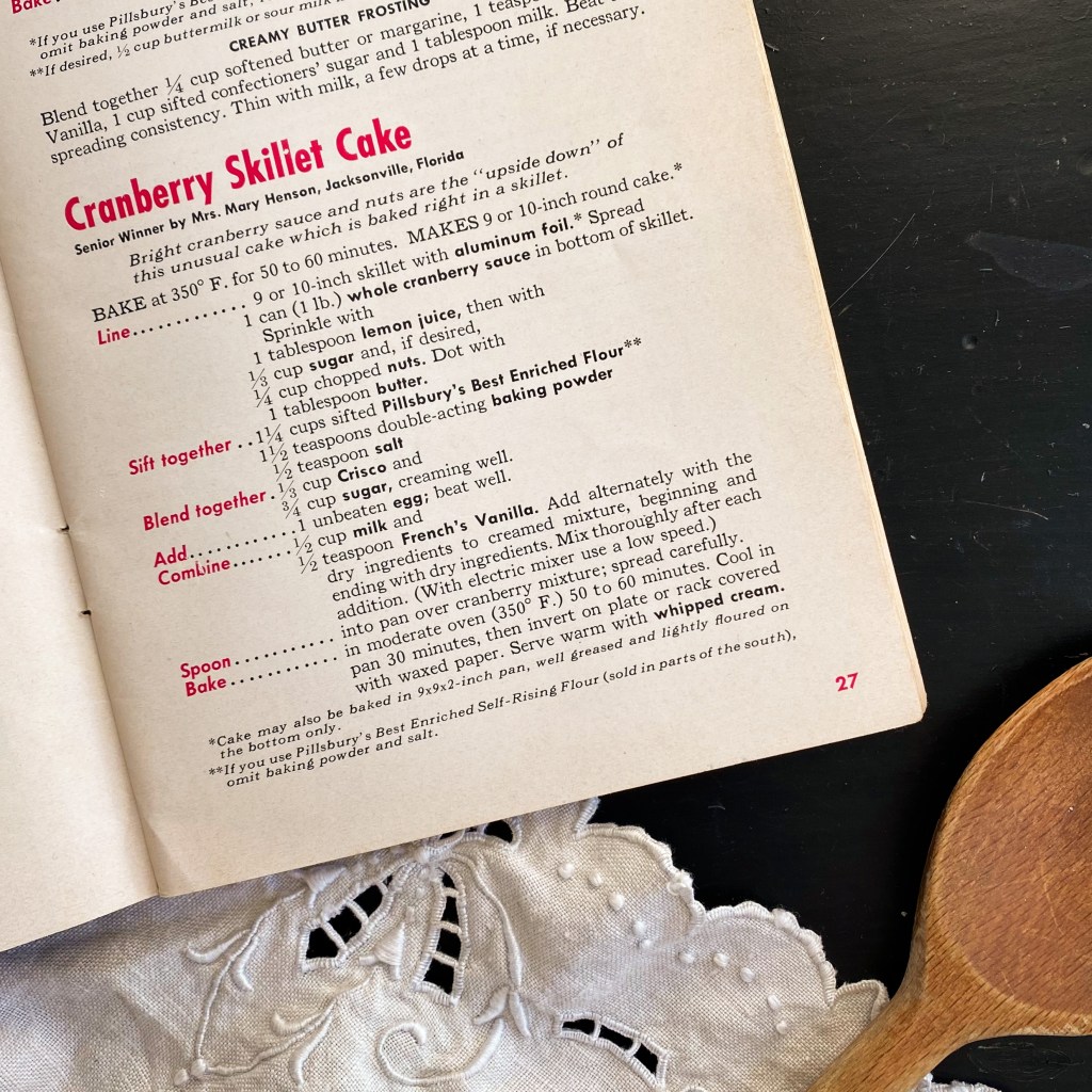 Thanks to a comment from one of our readers, we were able to find a similiar 1950s recipe for Cranberry Skillet Cake – a prize winning recipe by Mrs. Mary Henson of Jacksonville, Florida, who won the senior cake category of Pillsbury’s 6th Grand National $100,000 Recipe and Baking Contest in 1955.